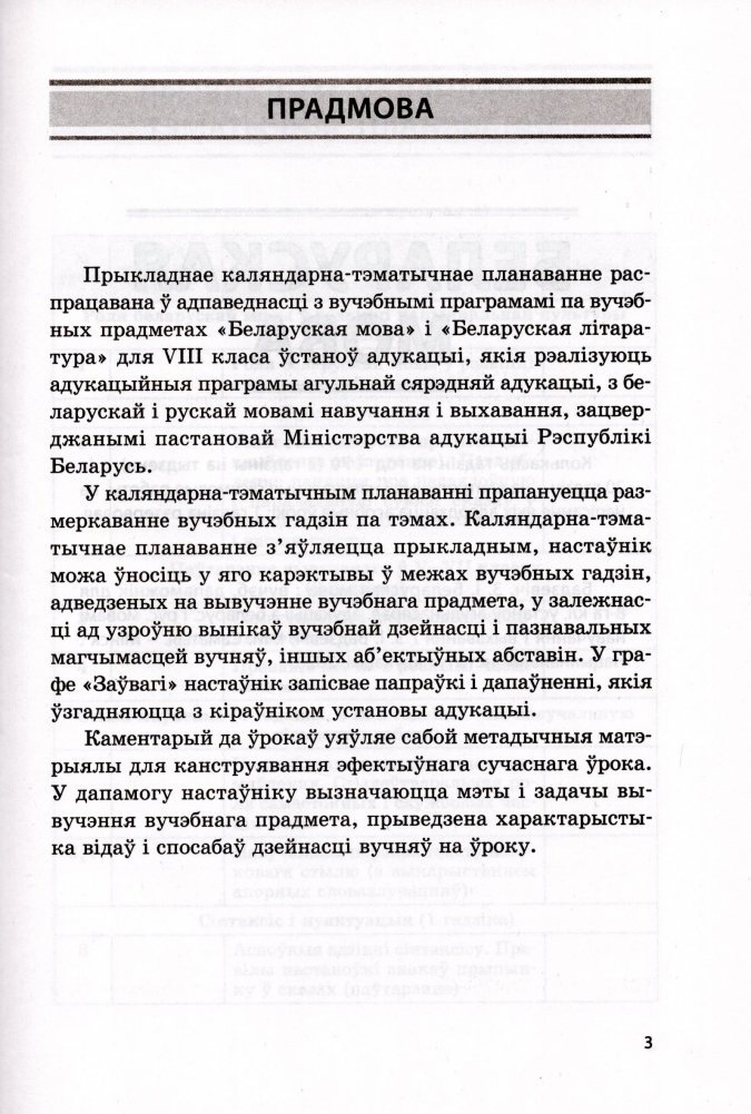 Прыкладнае каляндарна-тэматычнае планаванне распрацавана ў адпаведнасці з вучэбнымі праграмамі па вучэбных прадметах "Беларуская мова" і "Беларуская літаратура" для VIII класа ўстаноў адукацыі, якія рэалізуюць адукацыйныя праграмы агульнай сярэдняй адукацыі, з беларускай і рускай мовамі навучання і выхавання, зацверджанымі пастановай Міністэрства адукацыі Рэспублікі Беларусь.
