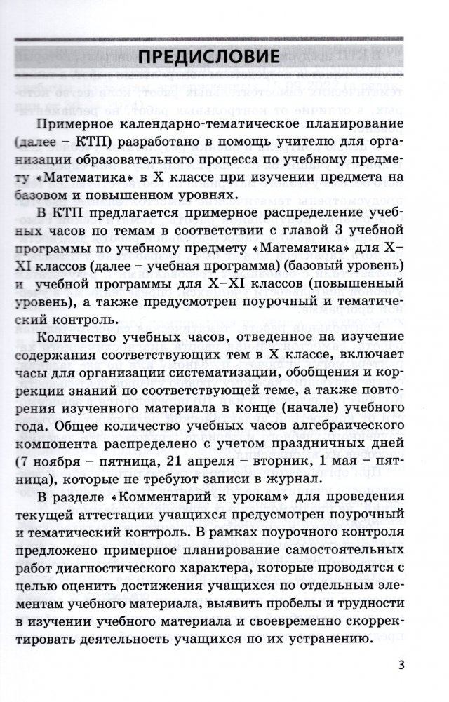 Примерное календарно-тематическое планирование разработано в помощь учителю для организации образовательного процесса по учебному предмету "Математика" в X классе при изучении предмета на базовом и повышенном уровнях.
