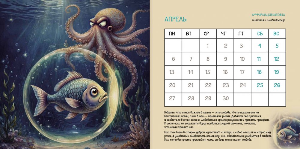 Вдохновение, приди! Вдохновение, приди!.. В пробке где-то стоит, наверное, нет его и нет. А вместе с ним нет и желания что-то делать. Но тут вдруг: "Шур-шур-шур!" Это ты открыл волшебный календарь на 2026 год от автора бестселлеров Зои Арефьевой. Чудесатый мир на иллюстрациях каждый день будет напоминать: волшебство совсем рядом, нужно только верить в него. Даже если мы не видим, Муроздание заботится о нас. Поэтому просто мечтай! В этом помогут авторские аффирмации и послания, написанные специально для этих календарей. Готов отпустить тревогу из-за проблем, почувствовать себя беззаботным ребенком и глотнуть свежего воздуха, чтобы дальше жить эту жизнь? Тогда скорее открывай календарь!