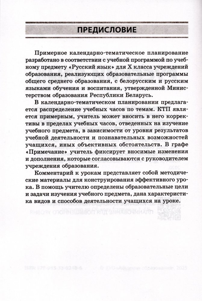 Примерное календарно-тематическое планирование разработано в соответствии с учебной программой по учебному предмету "Русский язык" для X класса учреждений образования, реализующих образовательные программы общего среднего образования, с белорусским и русским языками обучения и воспитания, утвержденной Министерством образования Республики Беларусь.
