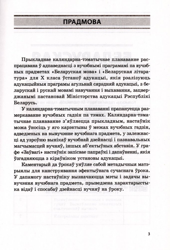 Прыкладнае каляндарна-тэматычнае планаванне распрацавана ў адпаведнасці з вучэбнымі праграмамі па вучэбных прадметах "Беларуская мова" і "Беларуская літаратура" для X класа ўстаноў адукацыі, якія рэалізуюць адукацыйныя праграмы агульнай сярэдняй адукацыі, з беларускай і рускай мовамі навучання і выхавання, зацверджанымі пастановай Міністэрства адукацыі Рэспублікі Беларусь.