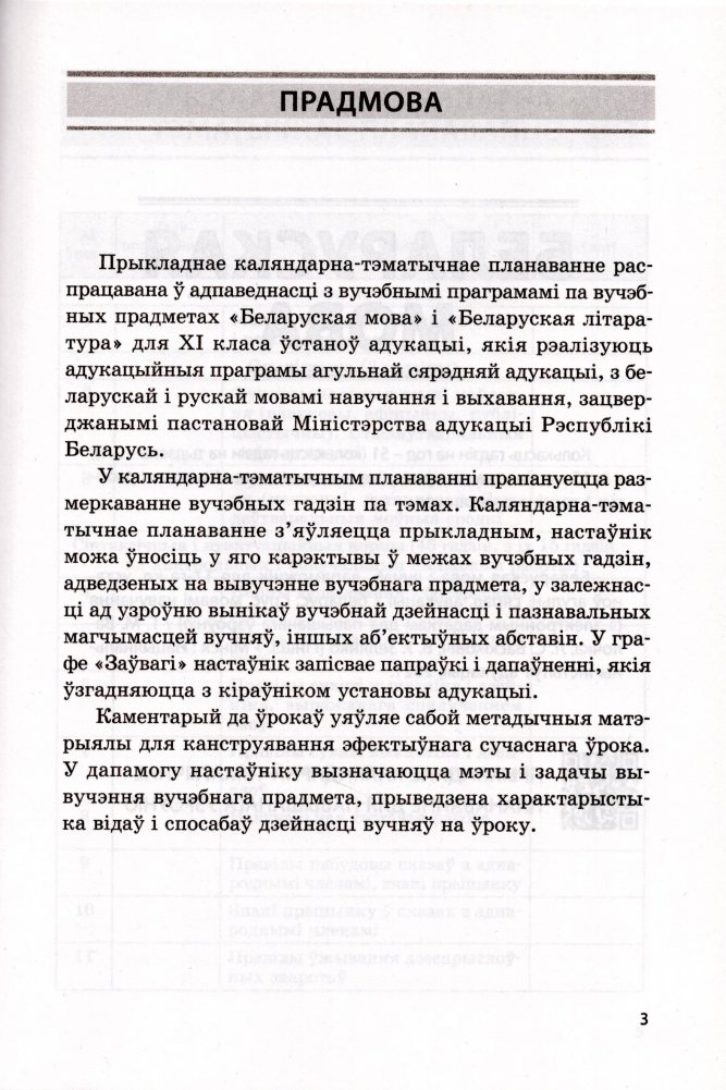 Прыкладнае каляндарна-тэматычнае планаванне распрацавана ў адпаведнасці з вучэбнымі праграмамі па вучэбных прадметах "Беларуская мова" і "Беларуская літаратура" для XI класа ўстаноў адукацыі, якія рэалізуюць адукацыйныя праграмы агульнай сярэдняй адукацыі, з беларускай і рускай мовамі навучання і выхавання, зацверджанымі пастановай Міністэрства адукацыі Рэспублікі Беларусь.