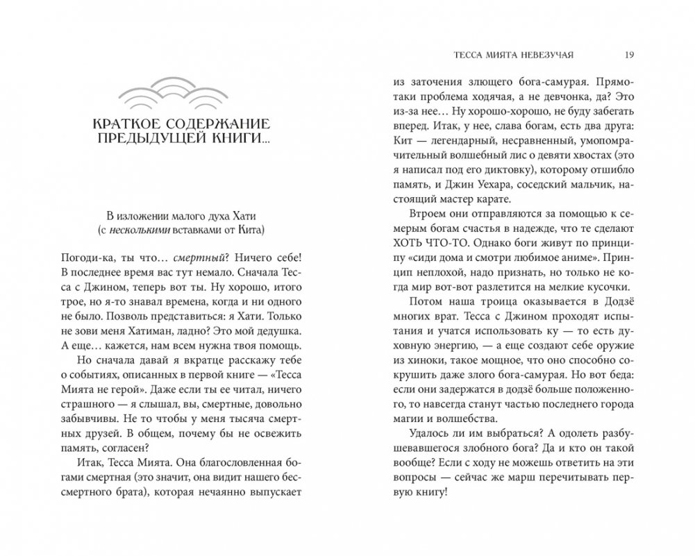 Два месяца прошло с тех пор, как Тесса и Джин спасли Токио и последний город магии и волшебства от злобного духа самурая. Друзья прекрасно проводят время. Они ходят на летние фестивали и лакомятся мороженым. И тут, в день праздника поминовения усопших, волшебные звери-оригами доставляют Тессе и Джину приглашения в Академию богов. После четырехсотлетнего перерыва вновь объявлены состязания, в которых кланы семи богов счастья выйдут друг против друга. Победители получат более высокий ранг в иерархии богов и духов. Проигравших ждет кара. Тесса и Джин присоединяются к клану невезучих. Им предстоит сразиться с теми, кто готовился к состязаниям все свое детство, и не пасть жертвой заговора таинственных охотников на богов.