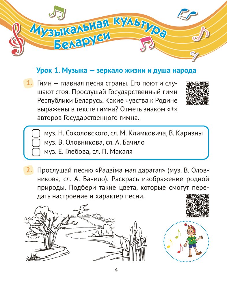 Рабочая тетрадь соответствует учебной программе по музыке и содержит разнообразные задания, направленные на развитие творческих способностей учащихся и формирование интереса к предмету. В пособии размещены QR-коды, с помощью которых четвероклассники смогут послушать фрагменты музыкальных произведений. На каждом уроке предусмотрена система самооценки. При закреплении знаний предлагается использовать гексы, доступные для бесплатного скачивания здесь, а также пособие «Музыка. 4 класс. Демонстрационные плакаты».
