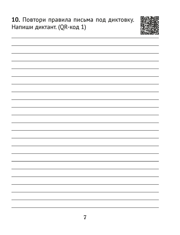 Пособие представляет собой тетрадь-тренажёр по подготовке учащихся 3 класса к письму под диктовку в соответствии с темами учебной программы. Каждый блок включает правило и задания для его отработки на практике, а также QR-код с аудиодиктантом, начитанным учителем начальных классов.
