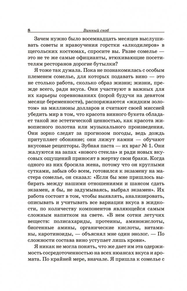 Автор книги «Винный сноб» тоже так думала, пока не погрузилась в изучение мира вина и не познакомилась с лучшими представителями профессии, для которых подавать вино — это не столько работа, сколько образ жизни во имя вкуса и удовольствия.