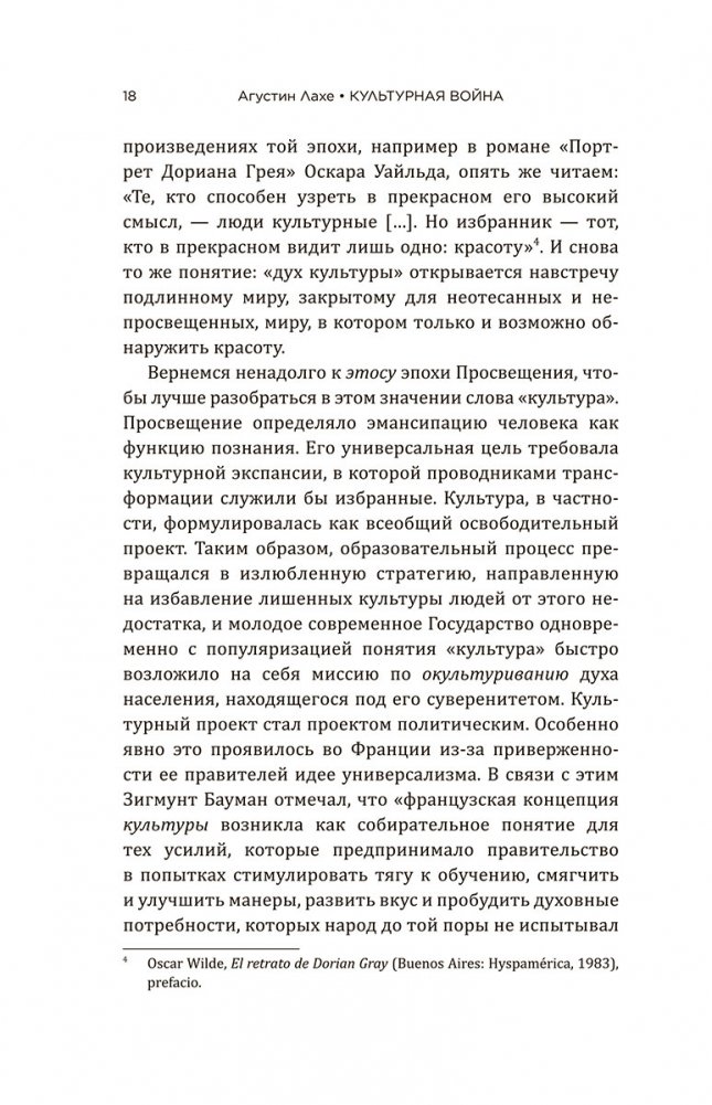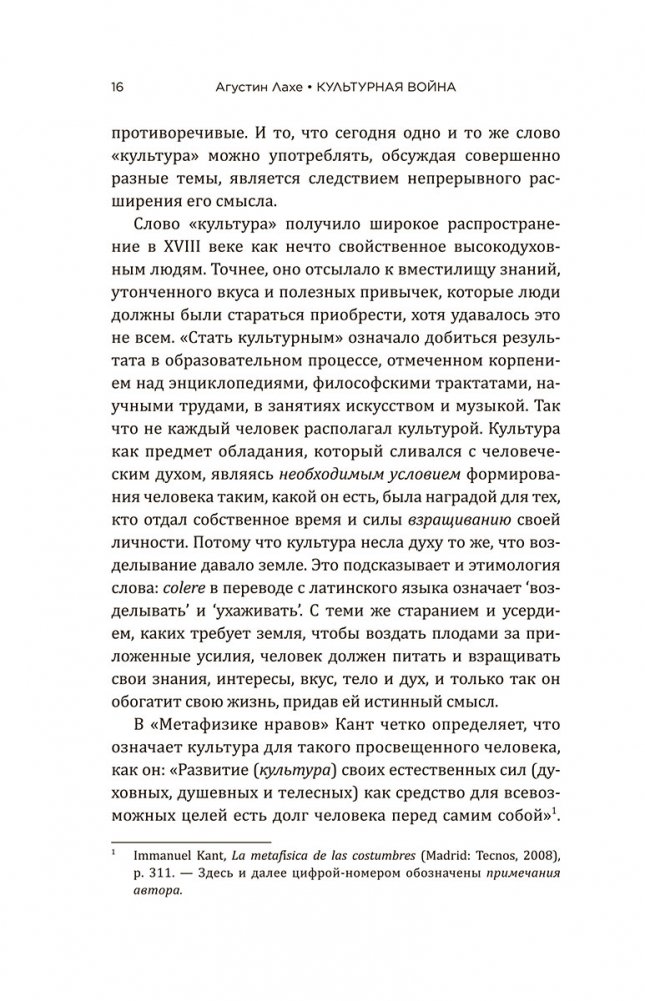 Известный писатель, политолог, интеллектуал, знаменитый своими лекциями, Агустин Лахе, опираясь на обширное литературное наследие самых выдающихся историков, социологов, философов и экспертов в области культуры и политики, дает определение понятию культурной войны и показывает, в какой степени культура обрела статус главного трофея власти, как именно зарождались и набирали силу подобные войны, начиная с эпохи модерна и до наступившего в наши дни постмодерна, и как в них выстоять. Параллельно он исследует, насколько хорошо разобрались в сути явления новые левые, в то время как правые недооценивали влияние культуры. Наконец, Лахе предлагает методы и средства, необходимые для рождения новых правых.