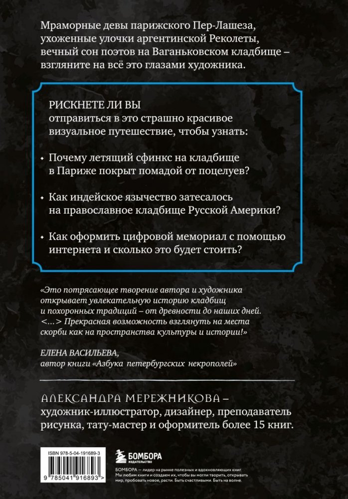 Иллюстрированная книга о главных кладбищах мира. Автор рассказывает о мемориальной архитектуре в формате исторических заметок – с акварельными иллюстрациями. Авторские рисунки помогут визуализировать рассказанное и проникнуться тихой красотой некрополей. Узнайте из книги, почему летящий сфинкс на кладбище в Париже покрыт помадой от поцелуев? Какому кладбищу посвящен целый фильм русского режиссера? И почему правительство и СМИ проигнорировали смерть Высоцкого? Это и многое другое в книге Александры Мережниковой – преподавателя рисунка, художника-иллюстратора, дизайнера и оформителя более 15 книг.