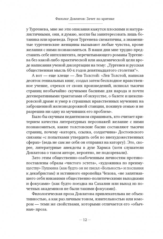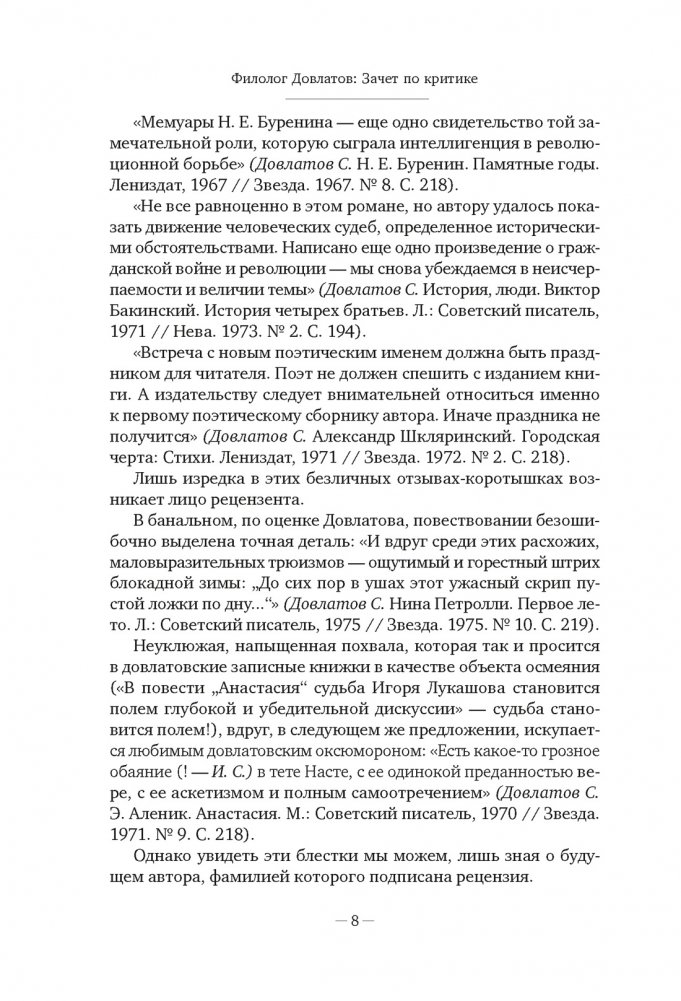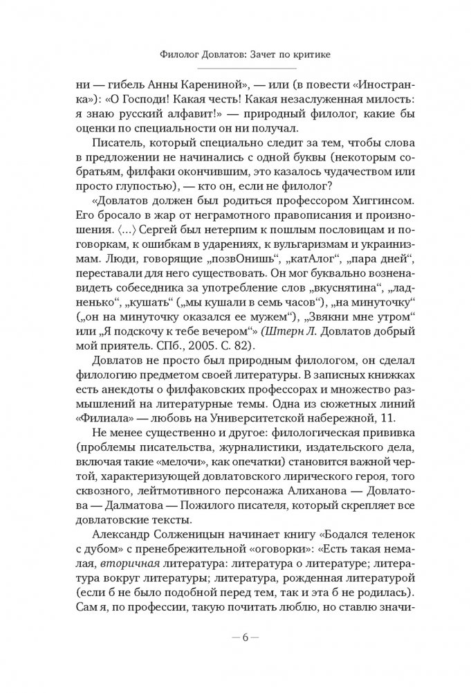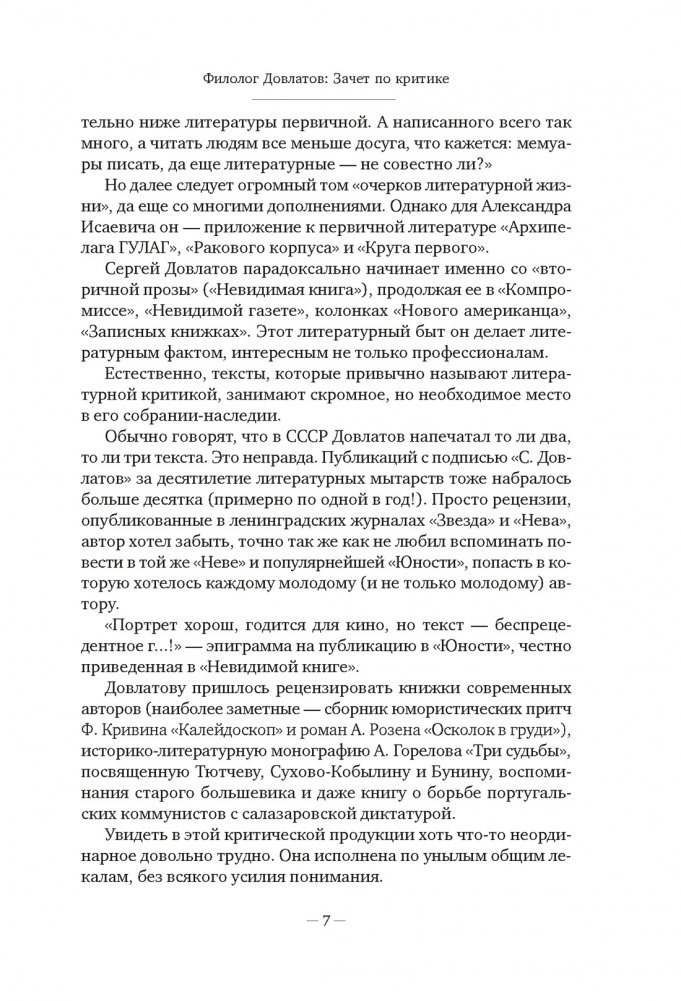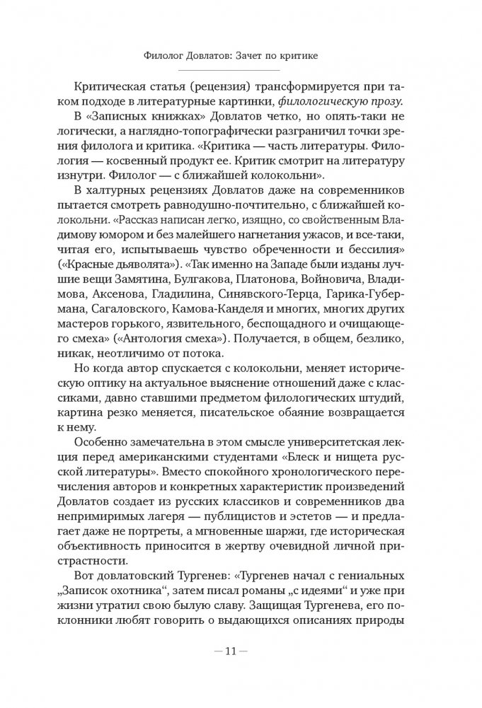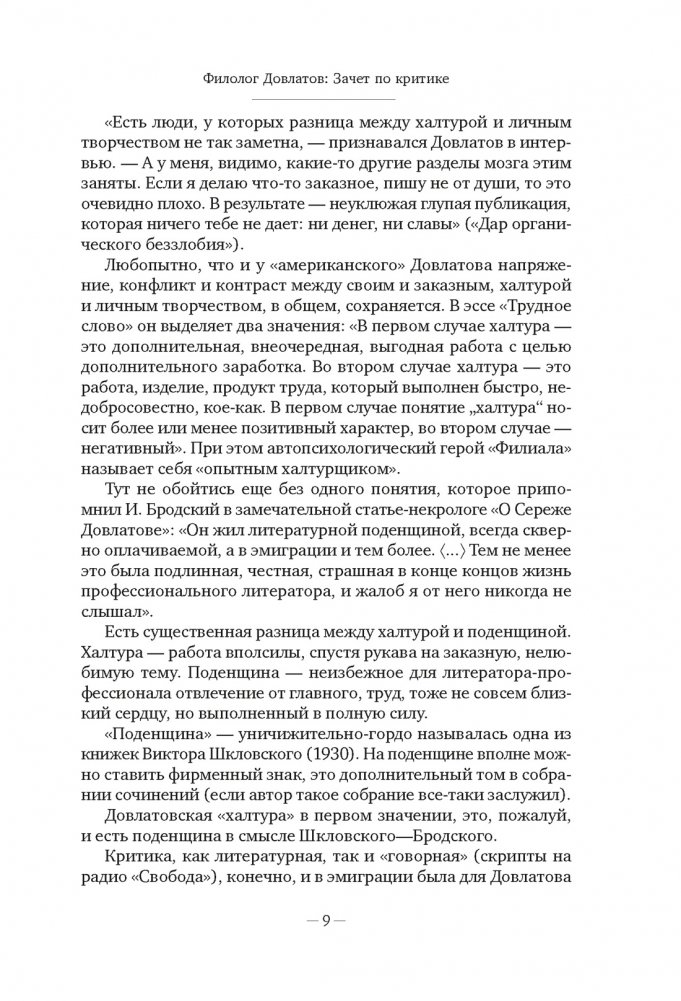 В первом разделе собрана его филологическая проза, печатавшаяся в эмигрантских газетах и журналах. Довлатов размышляет о судьбе и путях развития русской литературы; пишет о классиках — Пушкине, Толстом и Чехове; о своих современниках — Солженицыне, Викторе Некрасове, Аксенове, Войновиче, Бродском; о писателях третьей волны эмиграции и о тех, кто остался в Советском Союзе. Суждения и оценки Довлатова подчас точны, подчас субъективны, но неизменно остры и интересны: в его статьях и выступлениях обозначены ключевые проблемы и тенденции литературного процесса 1960–1980-х годов, участником которого был он сам.