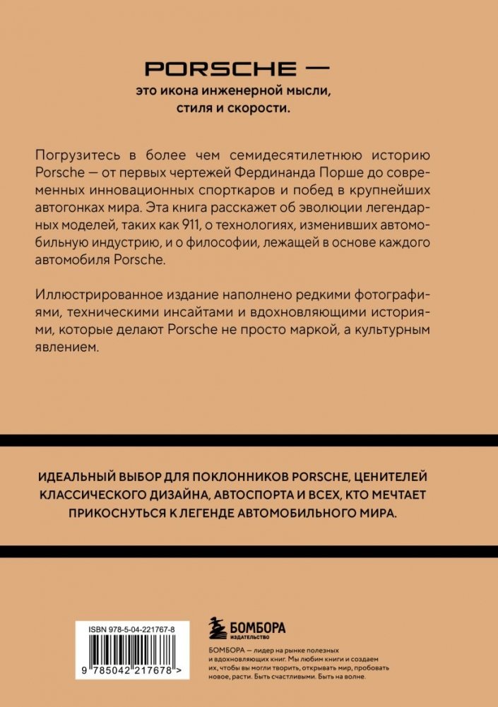 PORSCHE — это икона инженерной мысли, стиля и скорости. Иллюстрированное издание наполнено редкими фотографиями, техническими инсайтами и вдохновляющими историями, которые делают Porsche не просто маркой, а культурным явлением Идеальный выбор для поклонников Porsche, ценителей классического дизайна, автоспорта и всех, кто мечтает прикоснуться к легенде автомобильного мира.