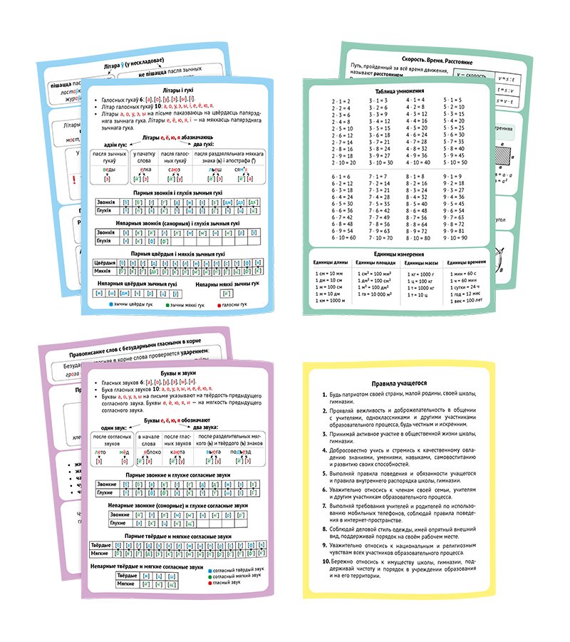 На обороте обложек размещена полезная информация по учебным предметам. Материал представлен в наглядной и доступной форме — в виде таблиц, схем и памяток.