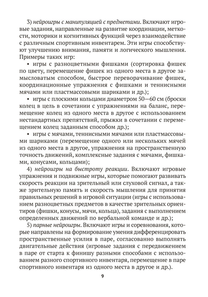 Пособие содержит авторские подвижные нейроигры, ориентированные на развитие физических качеств и двигательных способностей детей от 4 до 7 лет. Игры сопровождаются заданиями, которые требуют проявления внимания, логического мышления, памяти, точности движений, зрительно-моторной координации. Материалы издания способствуют реализации задач образовательной области «Физическая культура» учебной программы дошкольного образования.