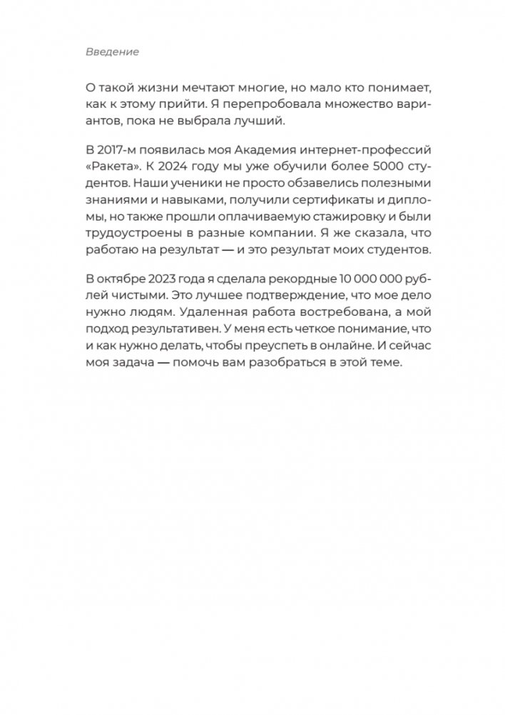 Александра Жабянская, популярный блогер, онлайн-предприниматель, специалист по удаленной работе, рассказывает, как устроено онлайн-пространство и откуда там появляются деньги. Вы сможете разобраться, что выбрать: удаленную работу, фриланс или бизнес. Книга мотивирует стремиться к лучшей жизни и большему заработку, чтобы достойно обеспечивать себя и своих близких, дает конкретные рекомендации и упражнения, благодаря которым читатель получит ощутимый результат быстрее и легче.