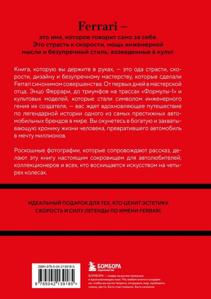 Роскошные фотографии, которые сопровождают рассказ, делают эту книгу настоящим сокровищем для автолюбителей, коллекционеров и всех, кто восхищается искусством на четырех колесах. Идеальный подарок для тех, кто ценит эстетику, скорость и силу легенды по имени Ferrari.