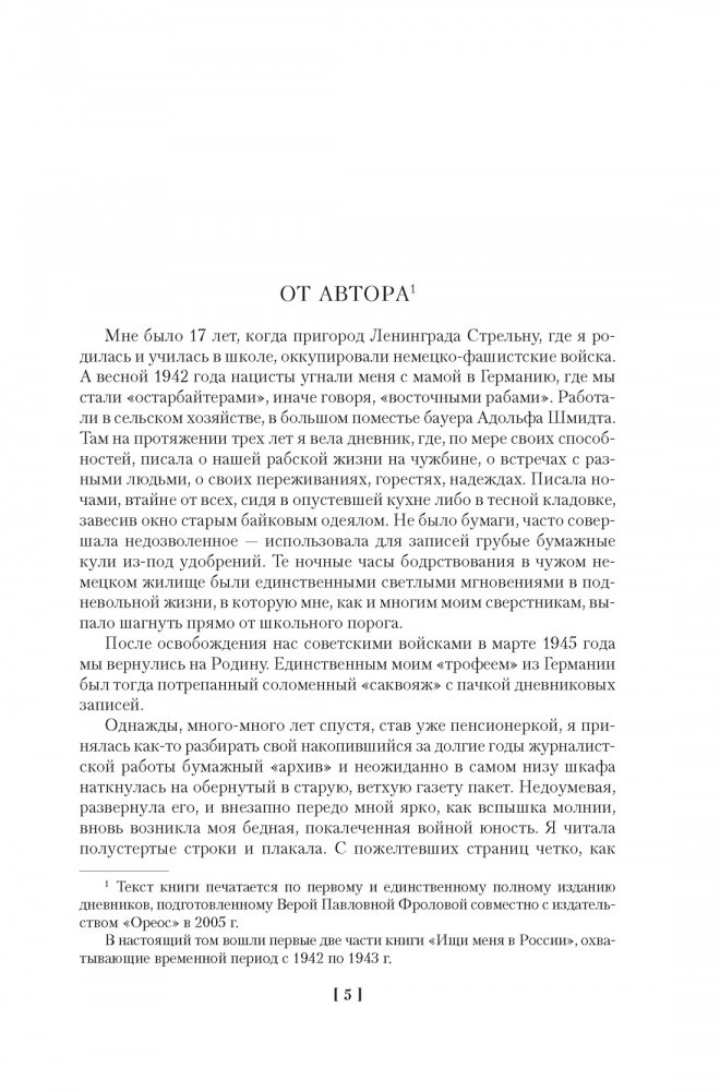 Летопись четырех лет жизни в неволе составила четыре части книги «Ищи меня в России». В настоящий том вошли первая и вторая части дневника Веры Павловны Фроловой, охватывающие события 1942 и 1943 годов.