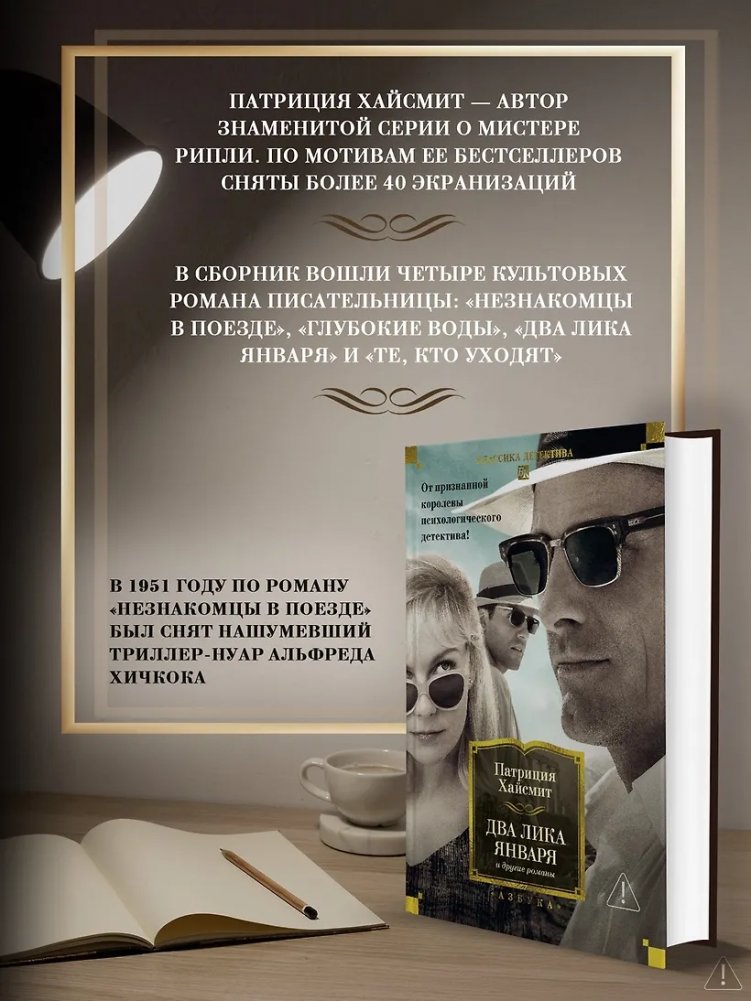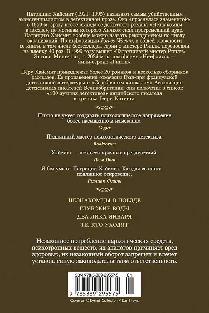 Патрицию Хайсмит (1921–1995) называют самым убийственным экзистенциалистом в детективной прозе. Она «проснулась знаменитой» в 1950-м, сразу после выхода ее дебютного романа «Незнакомцы в поезде», по мотивам которого Хичкок снял прогремевший нуар. Патрицию Хайсмит вообще можно назвать рекордсменом по числу экранизаций. По информации Forbes Woman, в общей сложности ее книги, в том числе бестселлеры серии о мистере Рипли, переносили на пленку 40 раз. В 1999 году вышел «Талантливый мистер Рипли» Энтони Мингеллы, в 2024-м на платформе «Нетфликс» — мини-сериал «Рипли».