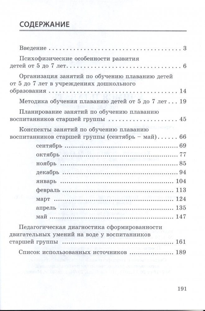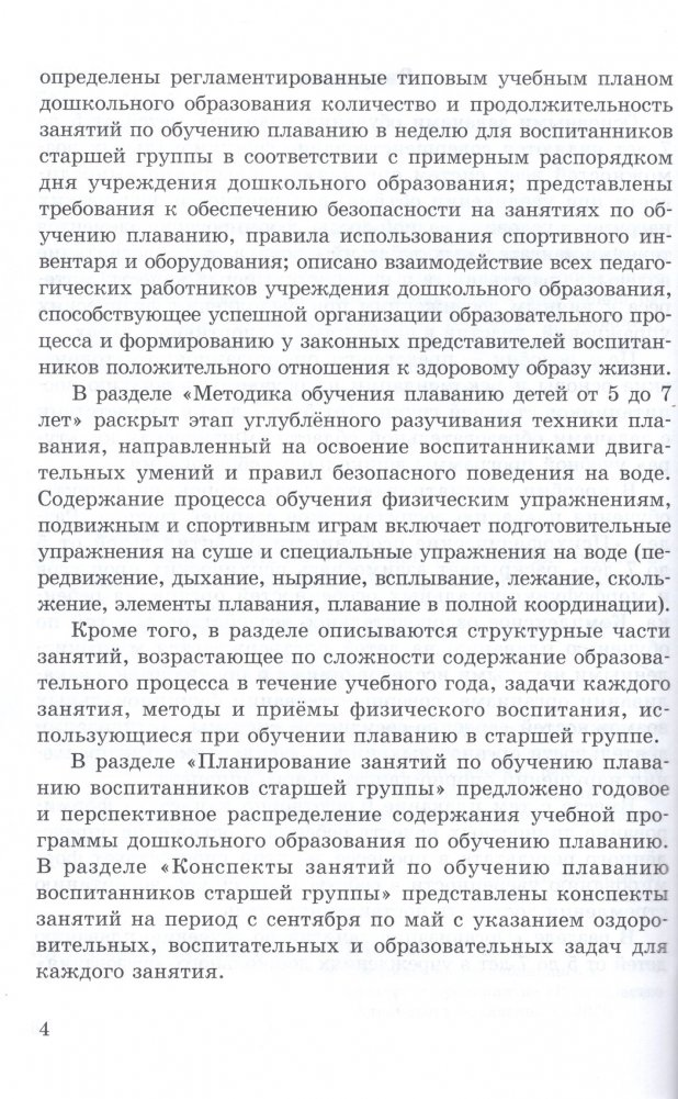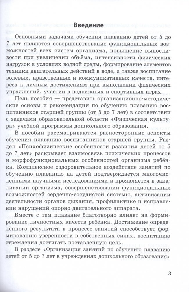 Содержание пособия соответствует образовательной области «Физическая культура» учебной программы дошкольного образования. В пособии представлены методические рекомендации и конспекты занятий по обучению плаванию воспитанников старшей группы (от 5 до 7 лет) учреждений дошкольного образования.