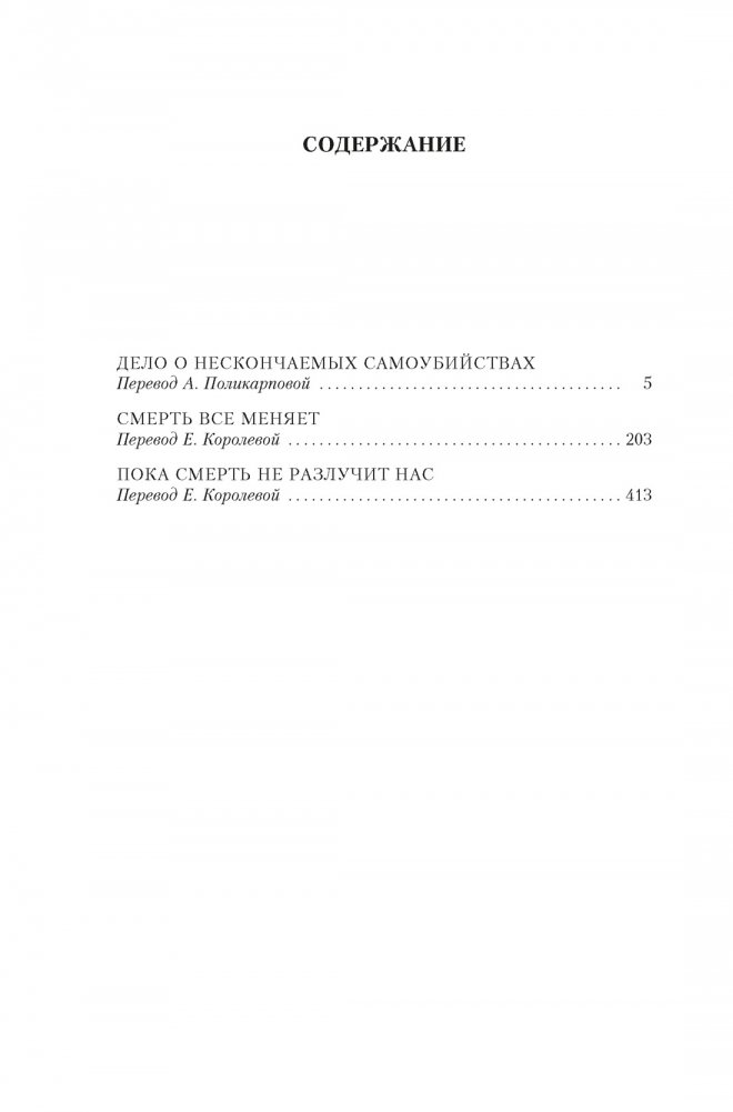В настоящий сборник вошли тринадцатый, четырнадцатый и пятнадцатый романы цикла о расследованиях хитроумного доктора Фелла, публикуемые в новых переводах: классическая «тайна запертой комнаты» «Дело о нескончаемых самоубийствах» (1941), «Смерть все меняет» (1942) — редкий роман, в котором автор, напротив, отступает от этого знакового для его творчества сюжетного приема, и «Пока смерть не разлучит нас» (1944) — роман, который сам Карр считал одним из лучших своих произведений.