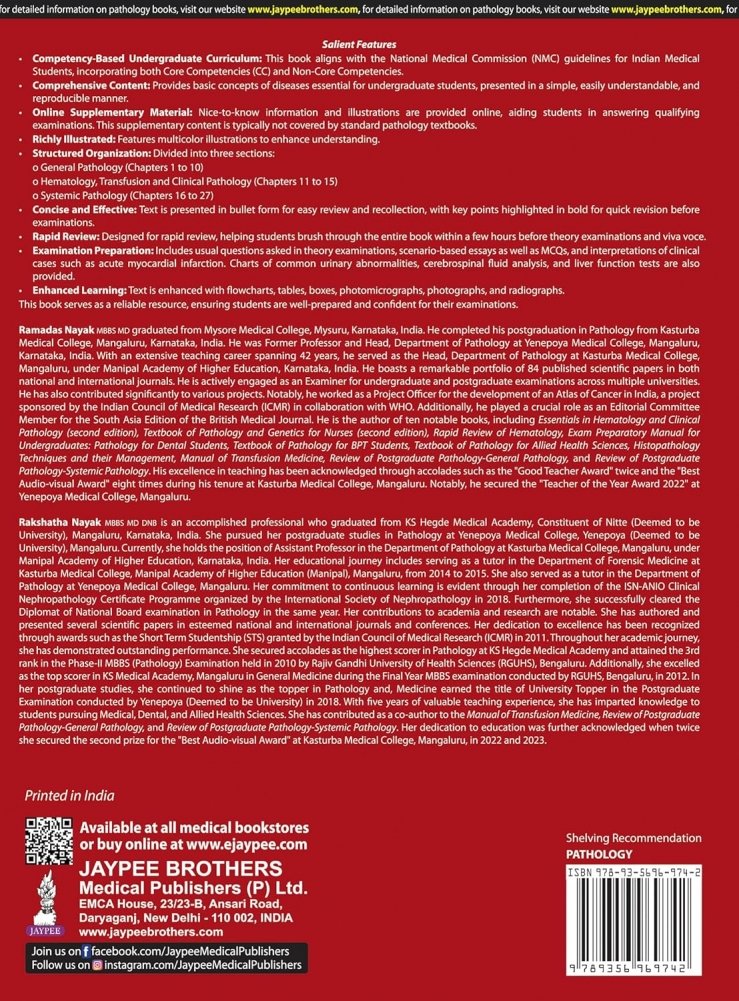 Pathology is a rapidly expanding, ever-changing, and interesting field in medicine. This book “Exam Preparatory Manual for Undergraduates—Pathology” aims to present vast knowledge of pathology in a clear manner for undergraduate and postgraduate medical students and those in paramedical courses. It provides a sound understanding of disease mechanisms, which is foundational for basic science. This book consists of 27 chapters divided into three sections such as general pathology, hematology, transfusion and clinical pathology, and systemic pathology. Section 1 Covers basic pathologic mechanisms, including cell injury and adaptation, inflammation and healing, infections and infestations, hemodynamic disorders, immunopathology, neoplasia, genetic and pediatric diseases, environmental and nutritional diseases, and basic diagnostic cytology. Section 2 covers the hematology introduction, disorders of red and white blood cells, hemostasis disorders, blood banking and transfusion, and clinical pathology. Section 3 addresses diseases of various organ systems, including cardiovascular, respiratory, gastrointestinal, hepatobiliary, pancreatic, urinary, male and female genitals, breast, endocrine, musculoskeletal, skin, and central nervous system disorders. This edition is completely revised, updated, better illustrated, and a comprehensive manual for excelling in pathology examinations. Each chapter has been updated to include all core and noncore competencies as per CBME guidelines. Some figures and illustrations have been replaced with higher-quality images. Scenario-based multiple-choice questions are included at the end of each chapter.