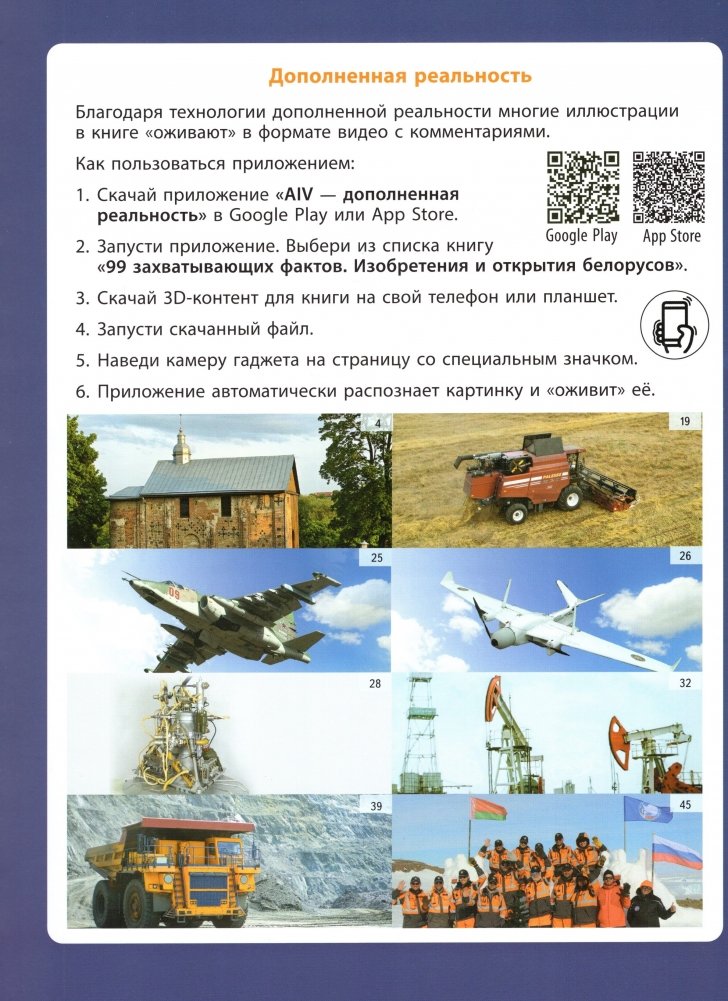 Красочно иллюстрированное издание знакомит читателей с удивительными историями и фактами о белорусских изобретателях и учёных. Как древние строители улучшали акустику в храмах? Кто первым лечил электричеством и создал старейший комбайн? Как белорусы помогли Гагарину полететь в космос? Чем занимаются учёные в Антарктиде и как создают суперкомпьютеры и роботов? На эти и многие другие вопросы ответит интерактивная книга из серии «99 захватывающих фактов».