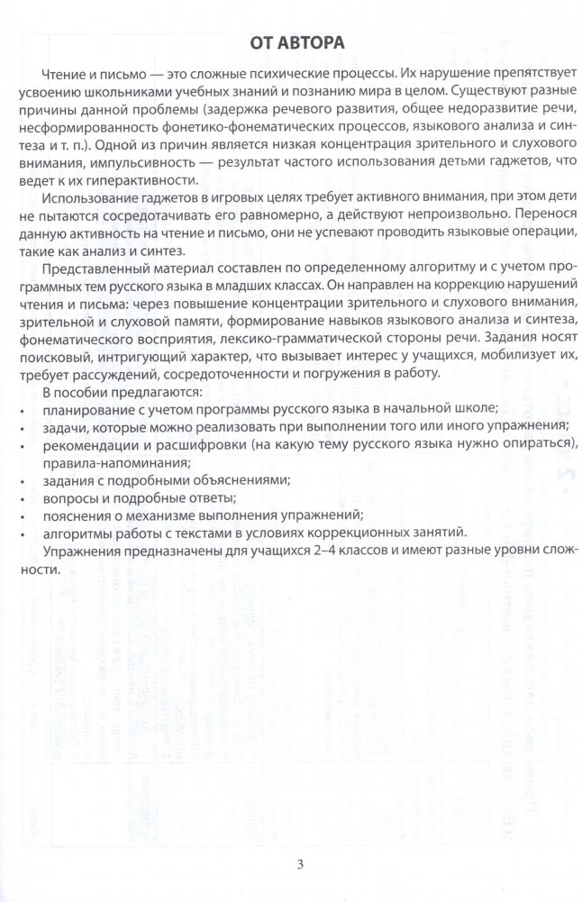 Пособие предназначено для коррекции нарушений чтения и письма у младших школьников. Предложенные задания направлены на развитие зрительного и слухового внимания, памяти, а также навыков языкового анализа и синтеза. Задания имеют интригующий характер, что способствует повышению интереса учащихся и их вовлеченности в процесс обучения.