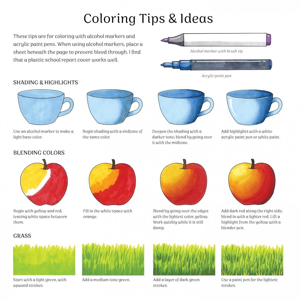 In addition to the coloring designs, you also get a page of stickers you can color yourself, as well as four pages of color inspiration that include suggestions for patterns you can use in your own coloring and a design fully colored in by Jane Maday.