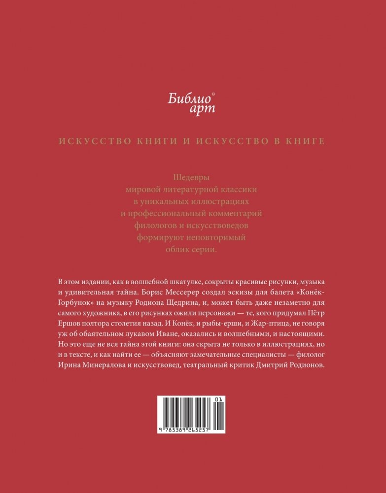 Борис Мессерер создал эскизы для балета «Конёк-Горбунок» на музыку Родиона Щедрина, и, может быть даже незаметно для самого художника, в его рисунках ожили персонажи, те, кого придумал Пётр Ершов полтора столетия назад. И Конёк, и рыбы-ерши, и Жар-птица, не говоря уж об обаятельном лукавом Иване, оказались и волшебными и настоящими. Но это еще не вся тайна этой книги – она скрыта не только в иллюстрациях, но в тексте, и как найти ее – объясняют замечательные специалисты – филолог Ирина Минералова и искусствовед, театральный критик Дмитрий Родионов.