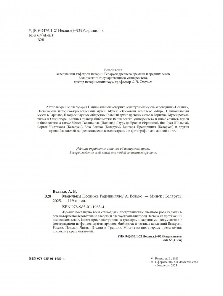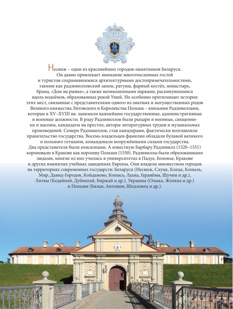 Издание посвящено всем семнадцати представителям знатного рода Радзивиллов, которые последовательно владели и благоустраивали город Несвиж на протяжении нескольких веков. Книга проиллюстрирована гравюрами, картинами, документами и фотографиями из фондов музеев, архивов, библиотек и частных коллекций Беларуси, России, Польши, Литвы, Италии и Франции. Многие из них впервые представлены широкому кругу читателей.