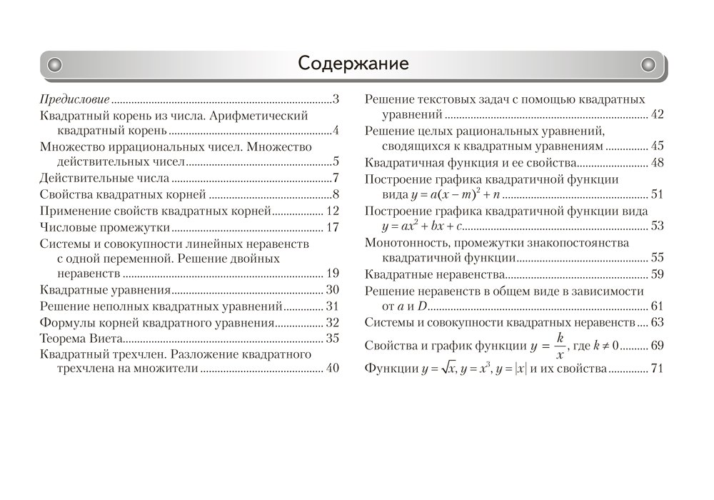 В пособии в форме опорных конспектов, наглядно представляющих учебный материал, отражены основные разделы курса алгебры, изучаемые в 8 классе. Использование опорных конспектов позволит учащимся сконцентрировать внимание на наиболее трудных для запоминания местах, многократно повторить изученное, а учителям — провести оперативный контроль усвоения материала, привлечь к проверке знаний родителей.
