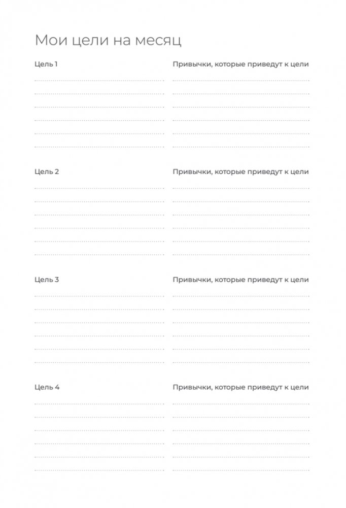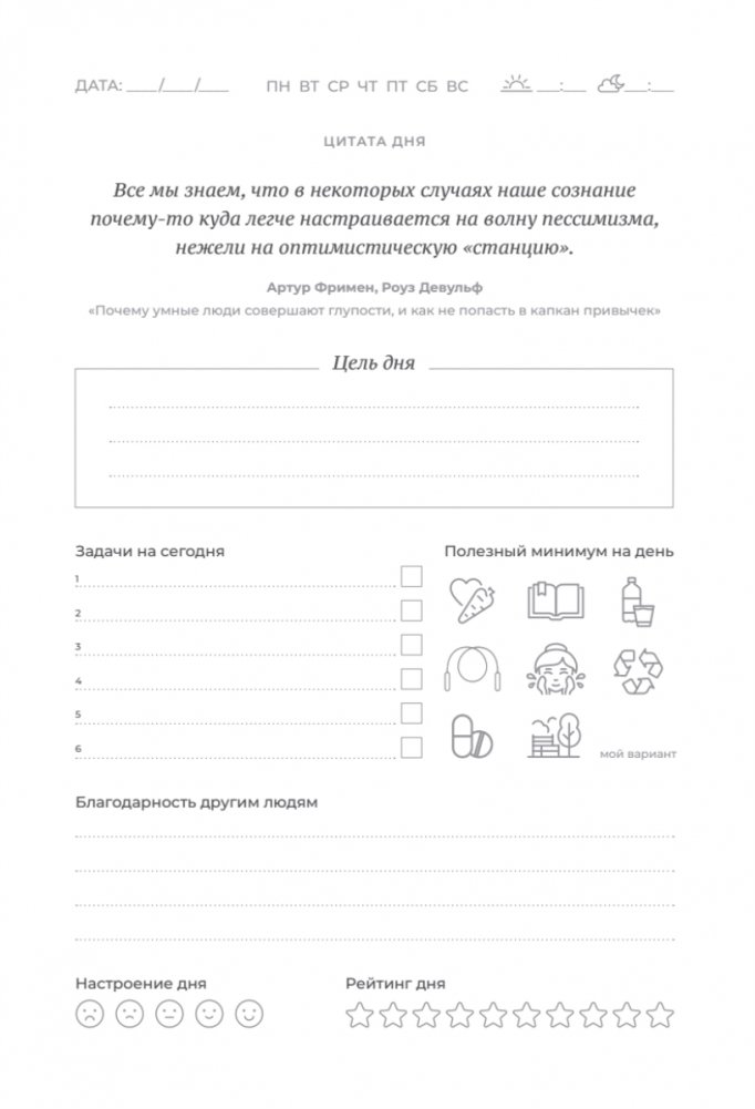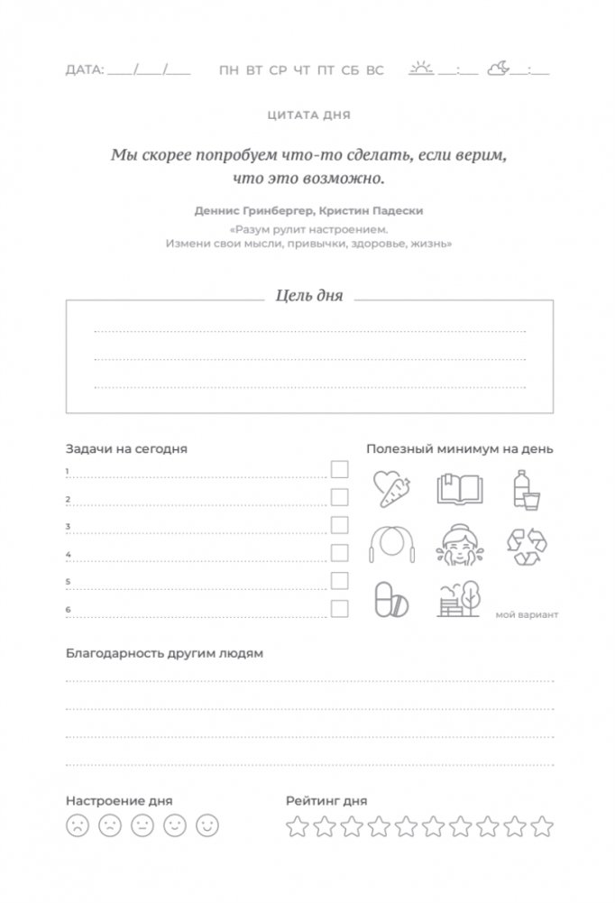 Как избавиться от плохих привычек и приобрести полезные? Начните с малого, чтобы добиться большего. А наш ежедневник поможет вам в этом. Основной блок, разлинованный по дням и рассчитанный на три месяца, включает в себя постановку целей и выработку привычек для их достижения. Мотивирующая цитата зарядит настроением на весь день. Утреннее планирование поможет не забыть выполнить все необходимые задачи; удобные иконки напомнят о мелочах для хорошего самочувствия, а вечерний обзор прошедшего дня поможет оценить личную результативность. Для тех, кто хочет жить осознанно, добиваться своих целей и вести здоровый образ жизни. Для фанатов всемирного бестселлера «Атомные привычки» Джеймса Клира, а также для тех, кто хочет оптимизировать и улучшить свою жизнь, мы создали этот ежедневник. Удобный формат. Три приятные soft touch-обложки на выбор.