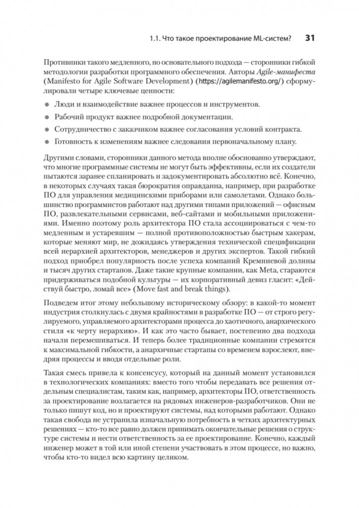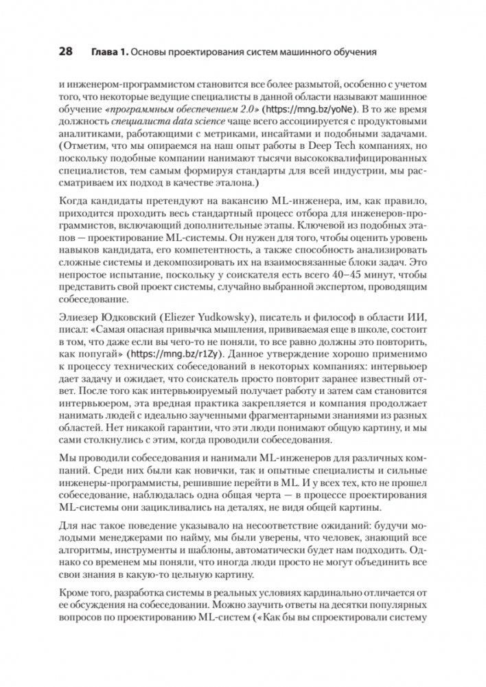 Проектирование и развертывание системы машинного обучения — это сложный многоэтапный процесс, требующий разнообразных компетенций и участия специалистов разных ролей. Независимо от того, интегрируете ли вы ML в существующий проект или проектируете ML-систему с нуля, вам необходимо ориентироваться в огромных датасетах и потоках, определять требования к тестированию и развертыванию, а также учитывать сложности внедрения ML-моделей в продакшен. Это практическое руководство по полному циклу разработки ML-проектов. Вы шаг за шагом пройдете весь фреймворк: проектирование, внедрение, релиз и сопровождение ML-системы. Чек-листы с необходимыми требованиями и примеры из реальной практики помогут развернуть и оптимизировать вашу собственную ML-систему. Вам особенно понравятся авторские байки и советы из личного опыта авторов, а также рекомендации по подготовке к System design интервью.