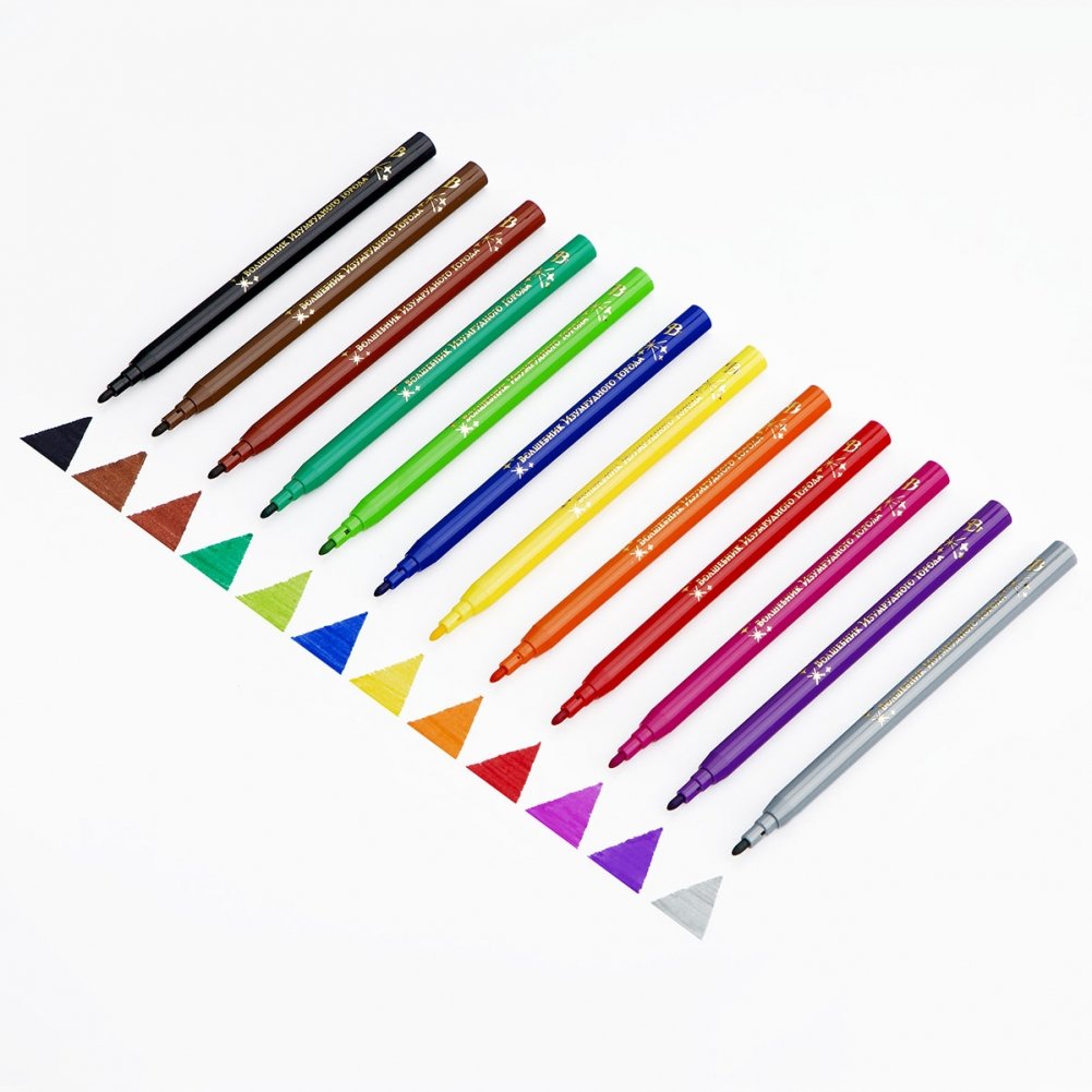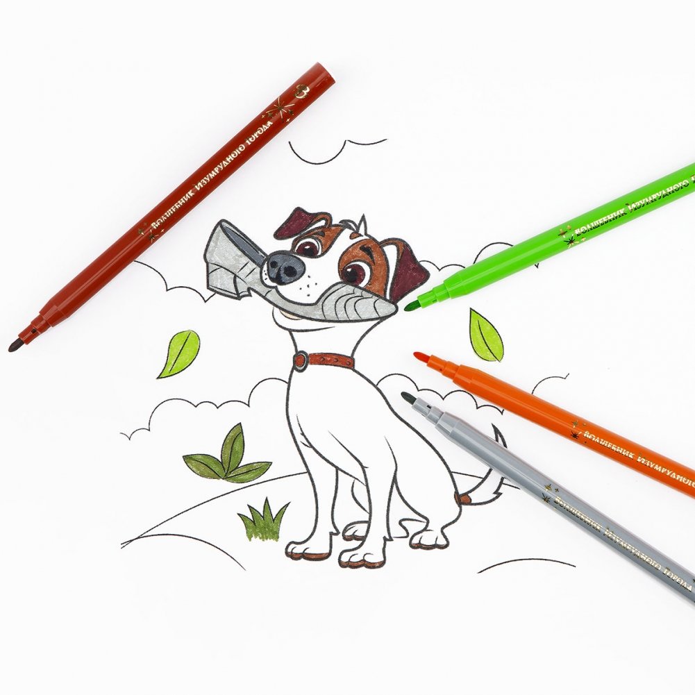 Фломастеры «Мульти-Пульти» эксклюзивной серии «Волшебник Изумрудного Города» представлены с легкосмываемыми чернилами и вентилируемым колпачком. В наборе — 12 ярких цветов. Корпус круглой формы изготовлен из полипропилена и имеет удобную зону захвата. Тип наконечника — конический. Толщина линии составляет 1 мм, длина письма — не менее 260 метров. Фломастеры сохраняют стабильный цвет при письме на протяжении всего использования. Прочный грифель защищён от продавливания. Набор упакован в картонную коробку с глянцевой ламинацией и красочным дизайном. Корпуса фломастеров изготовлены в цвет чернил с тиснением логотипа золотой фольгой.