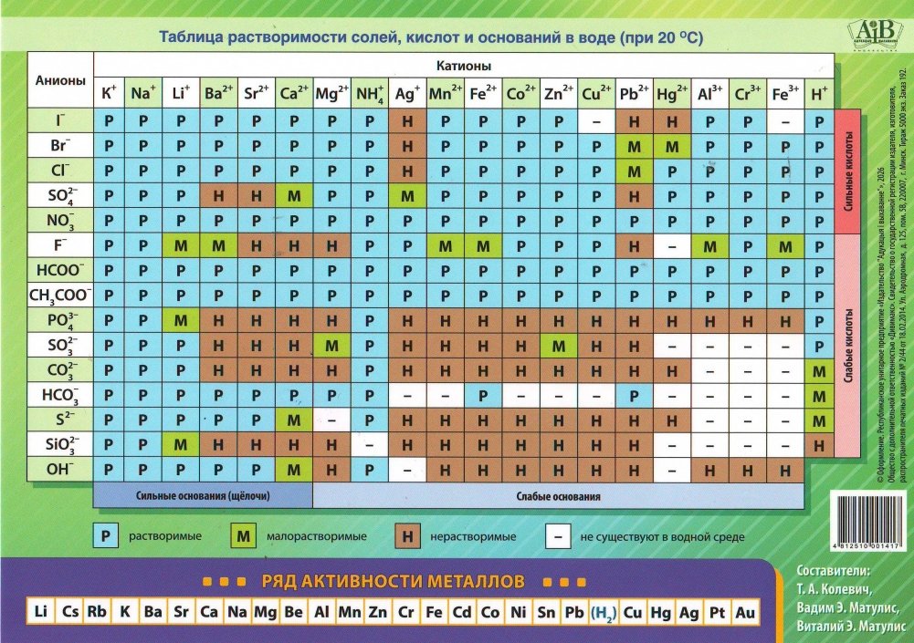 Также содержит таблицу растворимости солей, кислот и оснований в воде при 20 градусах Цельсия