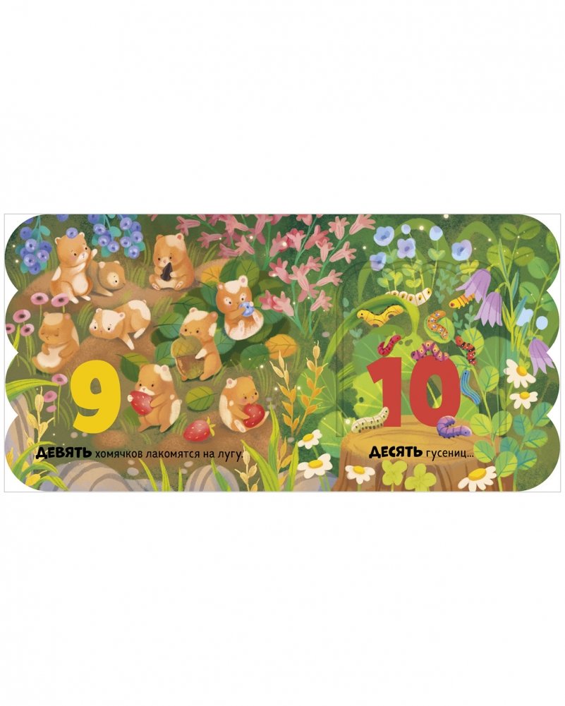 1 мишка, 2 птенца, 3 слоненка, 6 бутонов, 9 хомячков… «Первый счет» — чудесная первая книга малыша из прочного картона с пятью окошками для игры и развития мелкой моторики, книга для малышей, которая познакомит с животными и с цифрами до 10.
