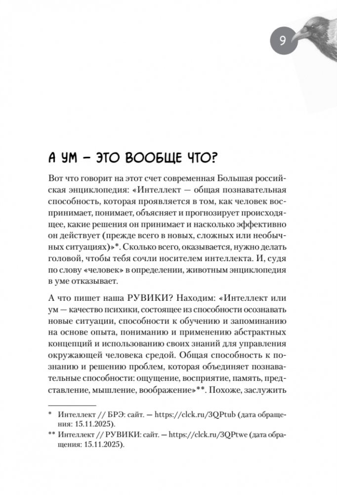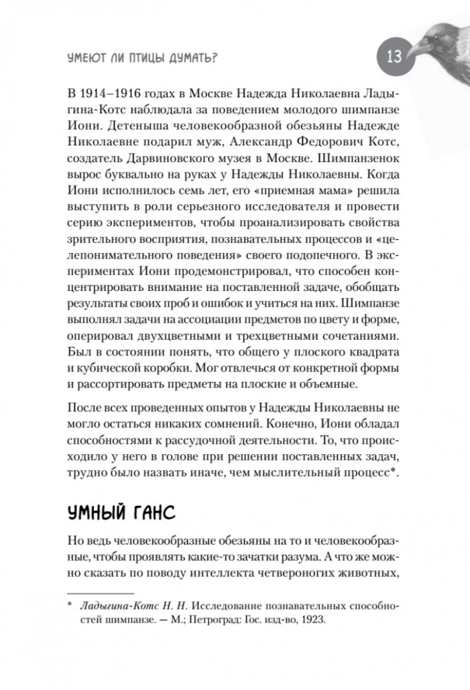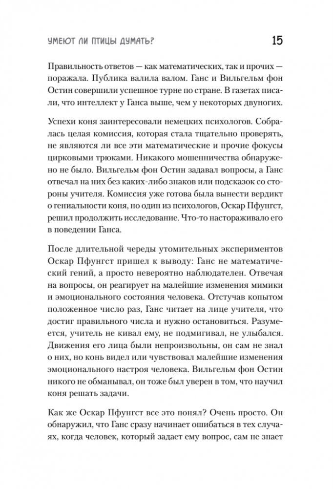Про особую сообразительность ворон знают все. Многие не раз наблюдали, как каркающая вредина выпотрошила урну, ограбила кота, обворовала птичью кормушку, расстегнула молнию на рюкзаке, стащила из-под носа ключи или кусок пиццы. А многим знакома их слаженная работа в небольших «криминальных группировках» и склонность к невинным развлечениям типа катания с горки и качания на проводах. Неужели эти птицы действительно настолько умны, что порой кажутся не глупее нас с вами? Или, может быть, их поведение — это просто результат работы каких-то генетических программ или сложных инстинктов? Можем ли мы всерьез говорить о вороньем интеллекте или это только наивные домыслы дилетантов? Научно-популярная книга Юлии Дунаевой отвечает на эти вопросы, в легкой и занимательной форме рассказывая читателям о результатах научных исследований специалистов, которые изучают особенности элементарного мышления ворон и других птиц. В разных научных лабораториях мира, в том числе и в нашей стране, экспериментаторы предъявляют карлушам разнообразные задачки на сообразительность и потом тщательно анализируют полученные результаты. К каким же выводам приходят ученые, пытающиеся прочитать вороньи мысли?