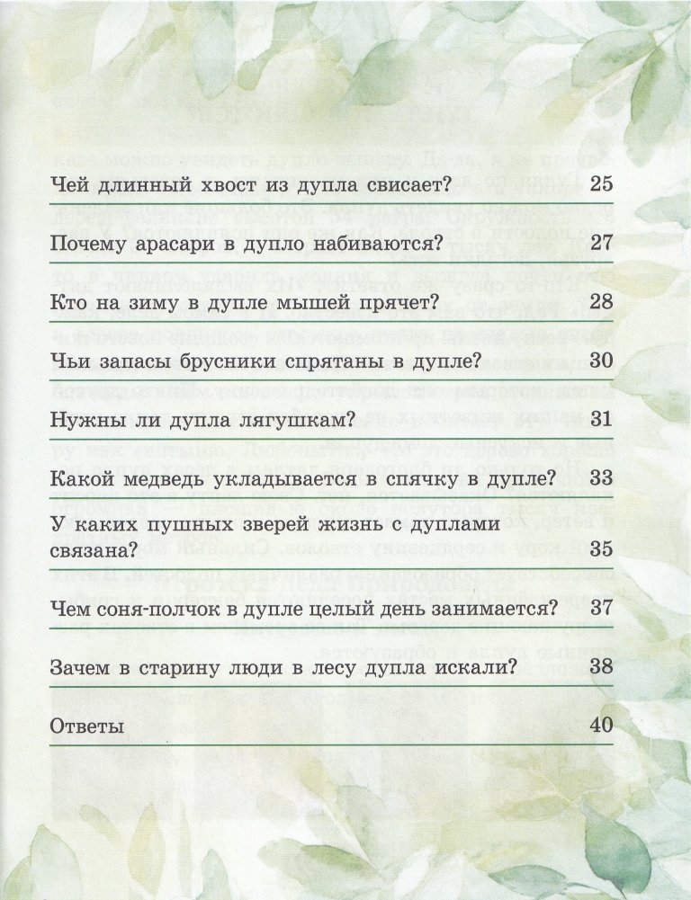 В этой книге Дед Природовед дает ответы на вопросы, которые интересуют многих. Читатели узнают, зачем птица-носорог замуровывает себя в дупле. Какая синица может дупло выдолбить? Что за утиный износ из дупла высовывается? Какой голубь в дупле птенцов выводит? Кто на зиму в дупле мышей запасает? Нужны ли дупла лягушкам? Какой медведь в спячку в дупло устроен? Чем занимается Соня-полчок в два дня?