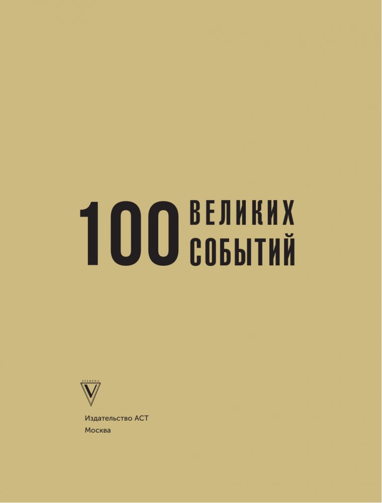 "100 великих событий" — захватывающее путешествие по важнейшим этапам человеческой истории. Книга бережно хранит воспоминания о великом прошлом: от первобытных рисунков в пещере Ласко до космического полета Юрия Гагарина.
