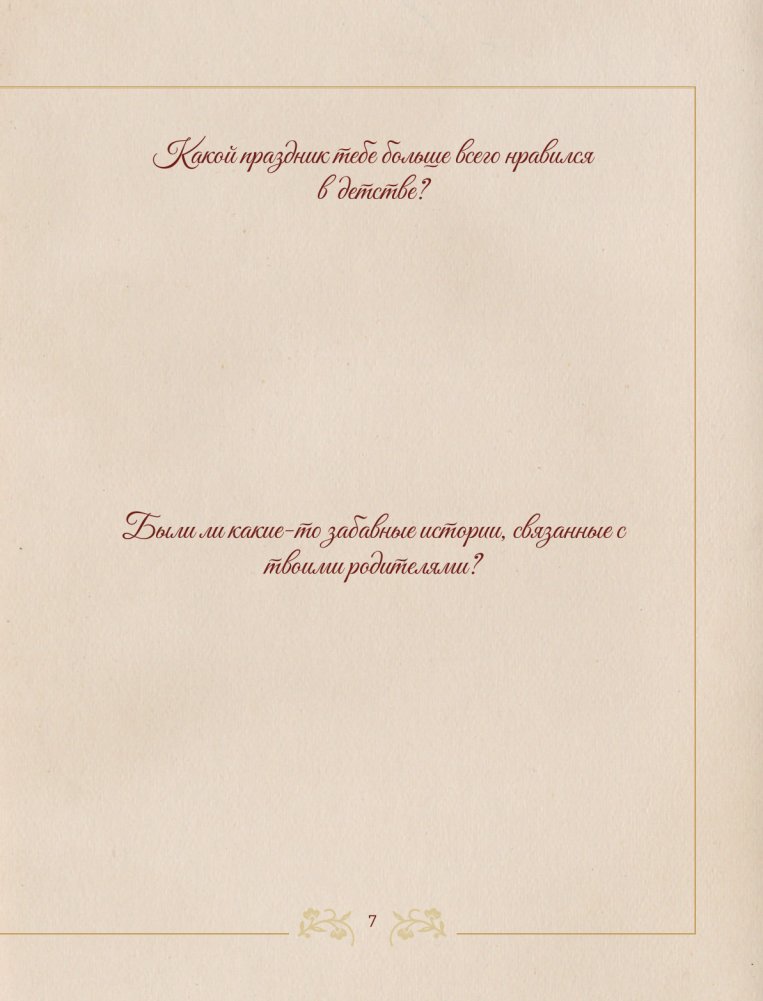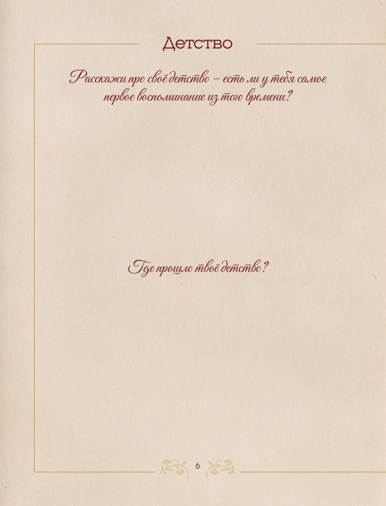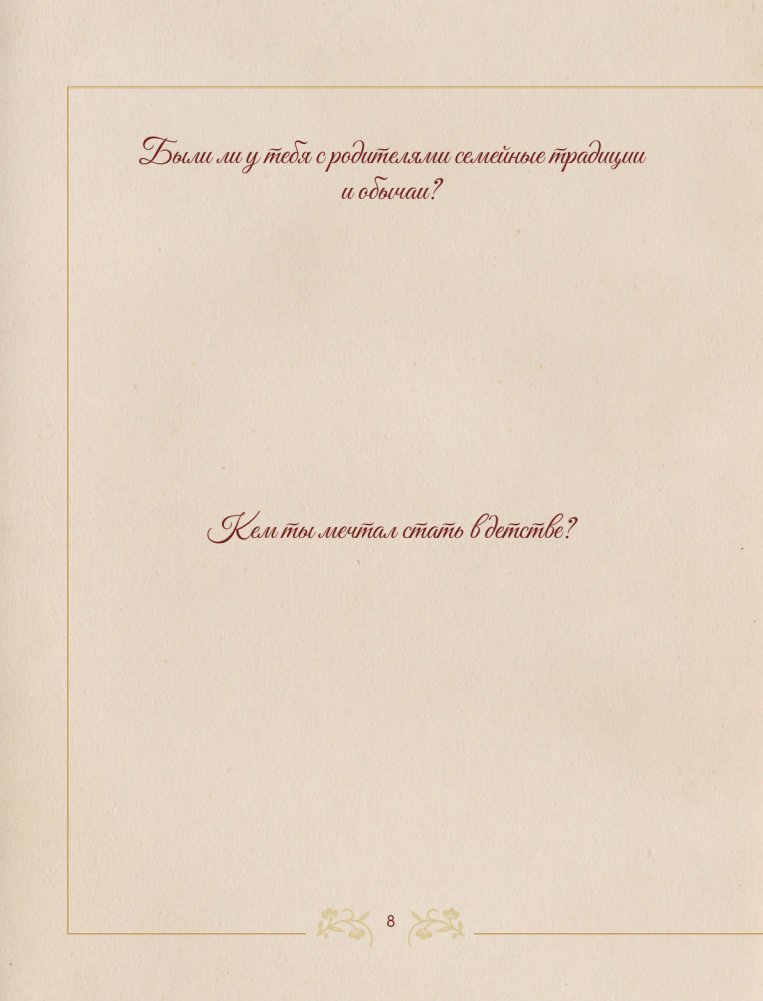 Внутри ты найдёшь вопросы, которые погрузят тебя в воспоминания о детстве, юности, семье, достижениях и мечтах. Это приглашение рассказать свою историю — ту, что мы хотим знать, помнить и передавать дальше.