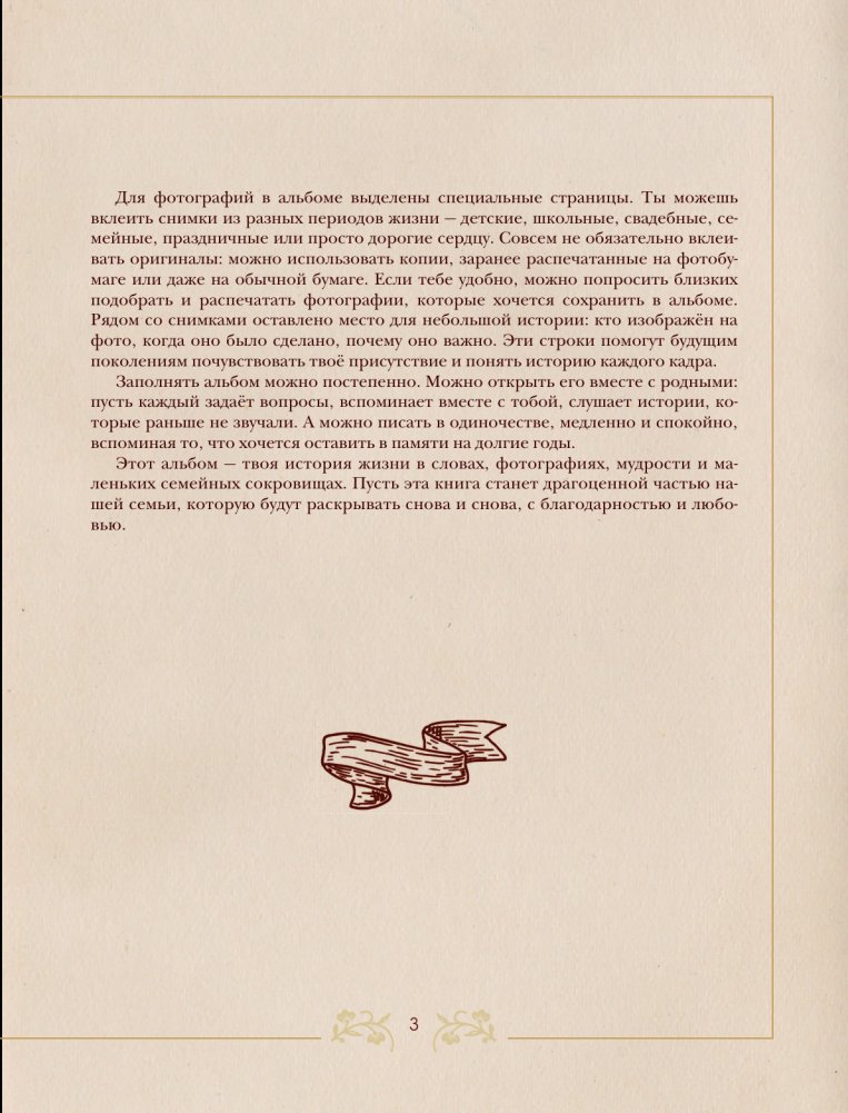 Пусть этот альбом станет поводом для тёплого общения, объединит поколения и станет настоящей семейной реликвией.