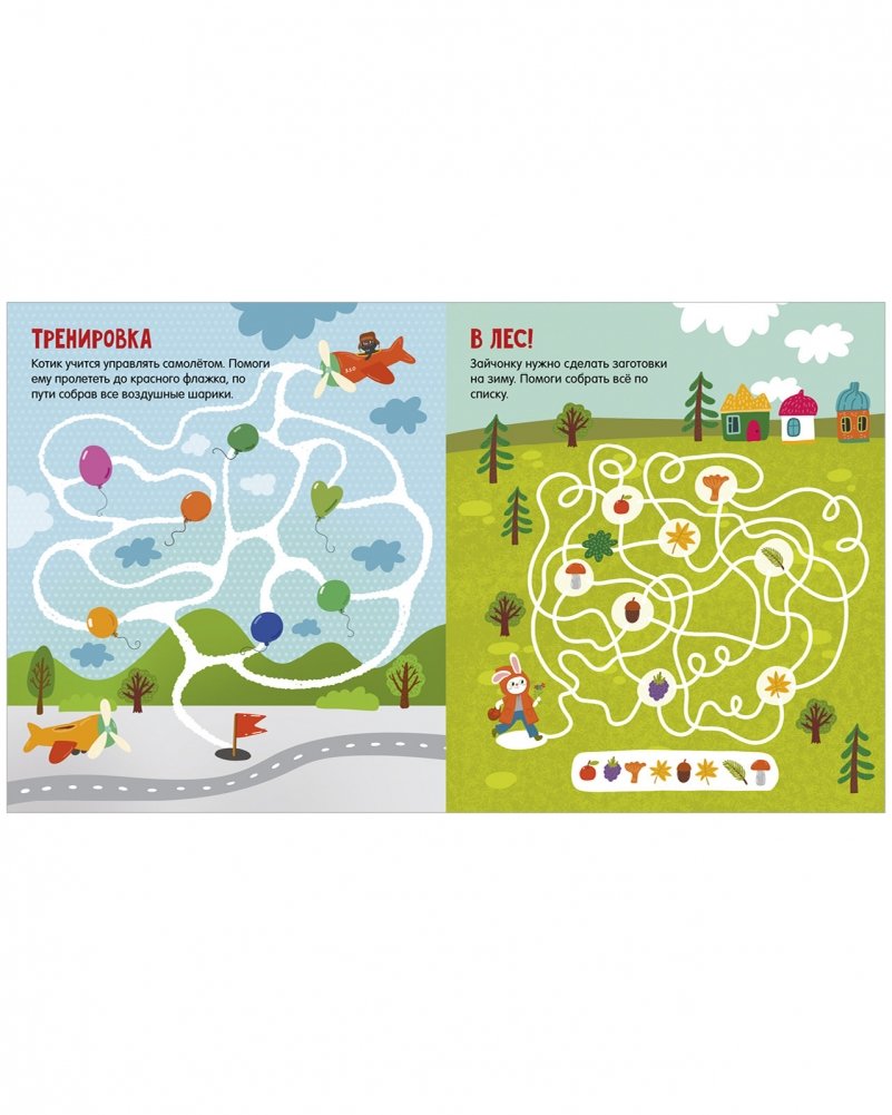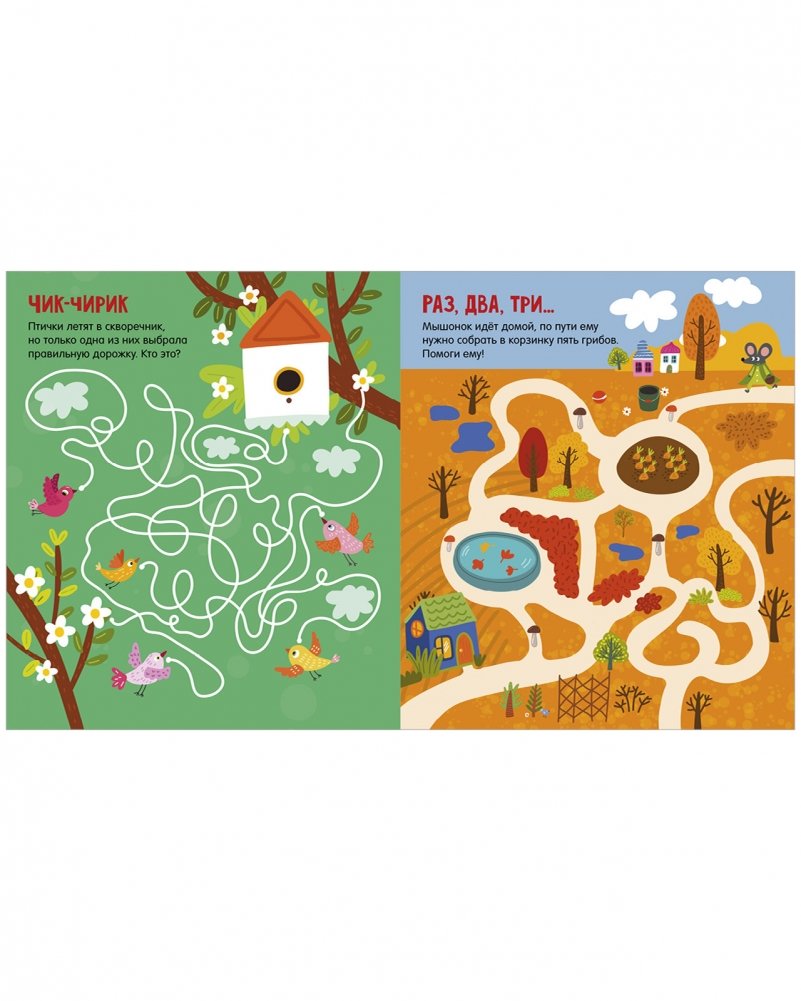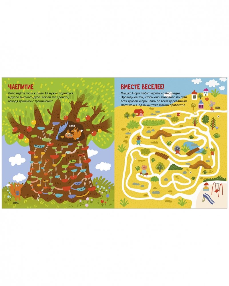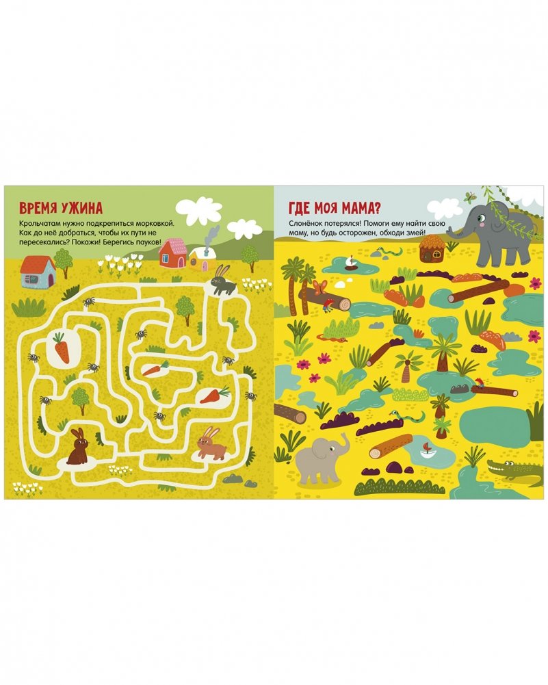 Вы встретите удивительных героев Clever книги и вместе с ними отправитесь в путешествия: со слоненком пройдете по саванне, чтобы помочь ему найти маму. Зайке поможете распутать путаницу и достать морковку. Белочку Лолу проведете по лабиринту к дуплу ее подружки белочки Лили, а птичек — по веткам — к их гнездышку.
