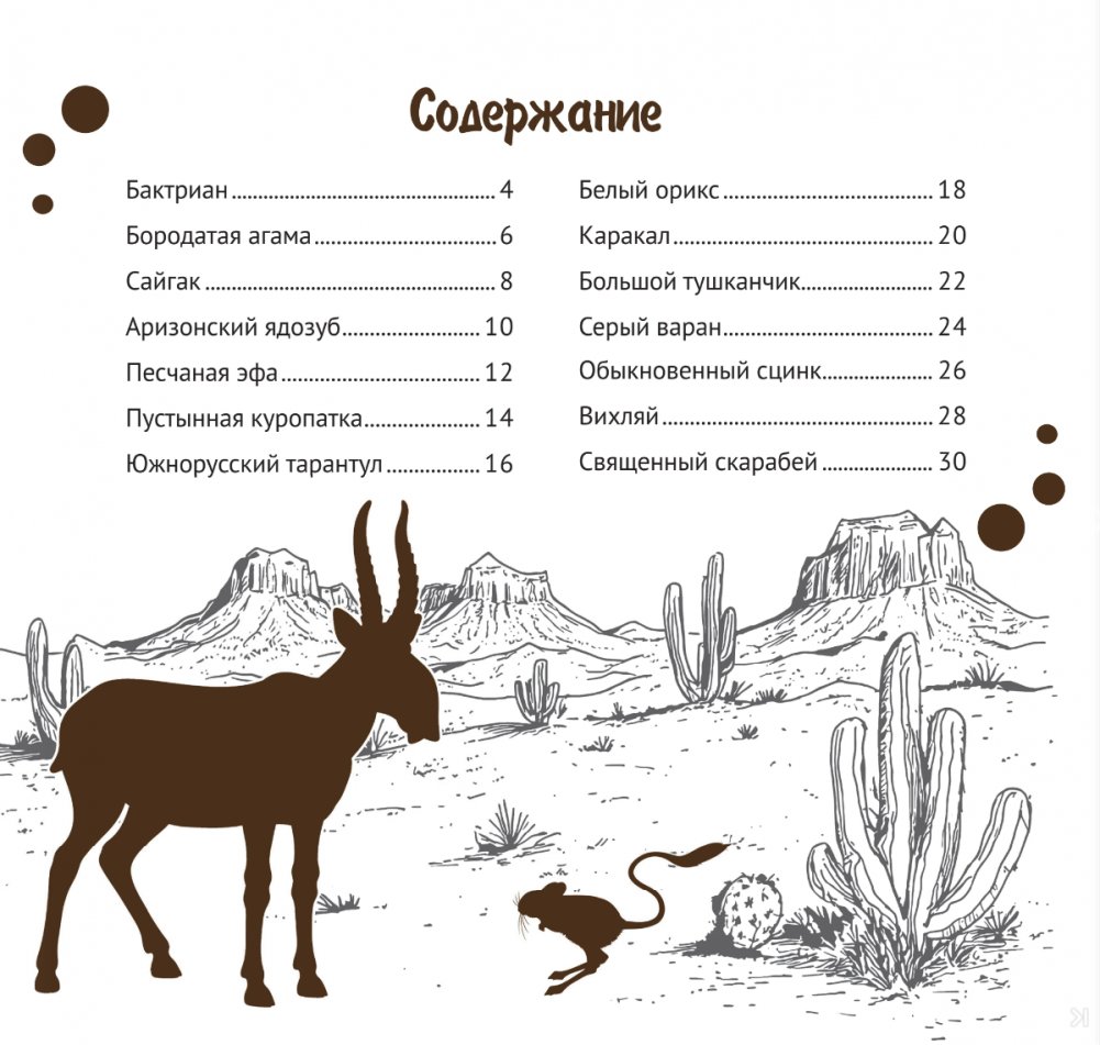 Книга знакомит с удивительными обитателями пустынь нашей планеты. На её страницах вы узнаете, почему бородатую агаму называют маленьким дракончиком, как каракал ловит летящих птиц в прыжке, зачем сайгаку подвижный нос-хоботок и многое-многое другое о таинственных жителях бескрайних песков.
