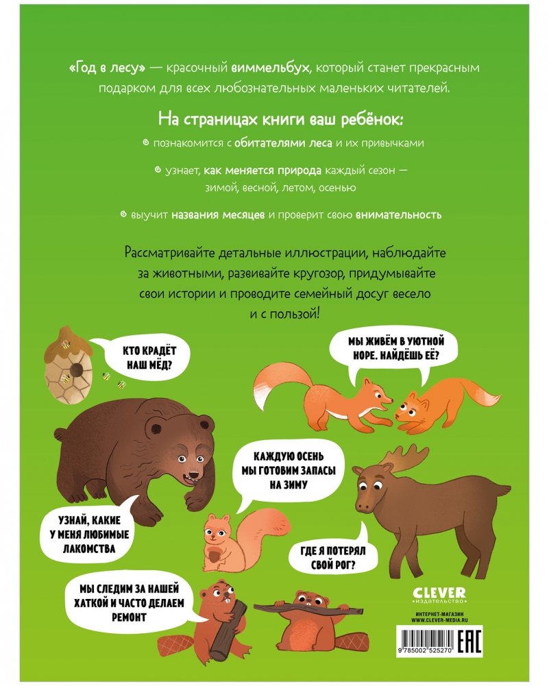«Год в лесу» — отличная первая книга малыша, которая приоткроет для ребенка мир чтения. Если вы ищете качественные книжки для детей 2 лет и книги для детей 3 лет, детские книги, которые будут не только развлекать, но и обучать, развивающие книги детские, такие книги для детей — прекрасный вариант. Эта книжка для малышей — хороший подарок ребенку 2 лет и старше.