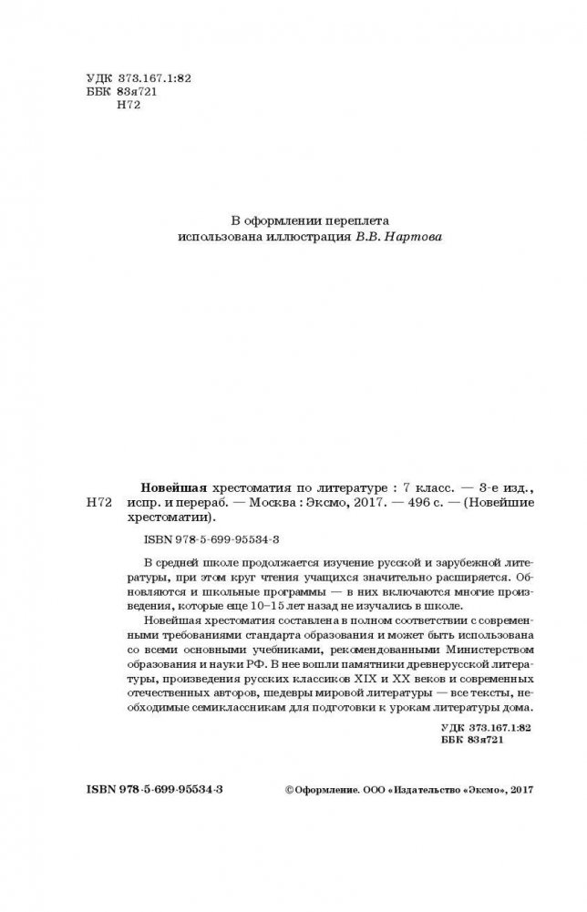 В средней школе продолжается изучение русской и зарубежной литературы, при этом круг чтения учащихся значительно расширяется. Обновляются и школьные программы — в них включаются многие произведения, которые еще 10—15 лет назад не изучались в школе. Новейшая хрестоматия составлена в полном соответствии с современными требованиями Государственного образовательного стандарта и может быть использована со всеми основными учебниками, рекомендованными Министерством образования и науки РФ. В нее вошли памятники древнерусской литературы, произведения русских классиков XIX и XX веков и современных отечественных авторов, шедевры мировой литературы — все тексты, необходимые семиклассникам для занятий в классе и при подготовке к урокам литературы.