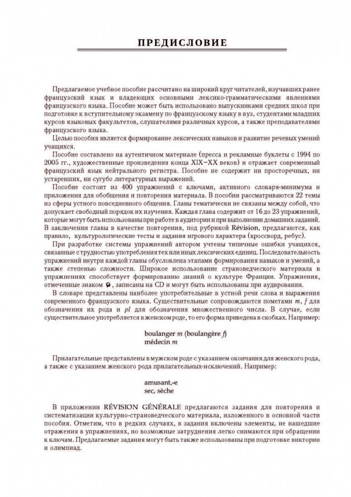 Настоящее учебное пособие направлено на формирование лексических навыков и развитие речевых умений. Книга представляет собой сборник из 400 упражнений с ключами, тематического словаря и заданий для повторения страноведческого материала, оформленных в приложение REVISION GENERALE. Пособие, составленное на аутентичном материале последних лет, отражает современное состояние французского языка и способствует формированию знаний о культуре Франции. Часть упражнений записана на CD и могут быть использованы при аудировании. Пособие может использоваться выпускниками средних школ при подготовке к вступительному экзамену по французскому языку в ВУЗ, студентами младших курсов языковых факультетов, слушателями различных курсов, а также преподавателями французского языка.