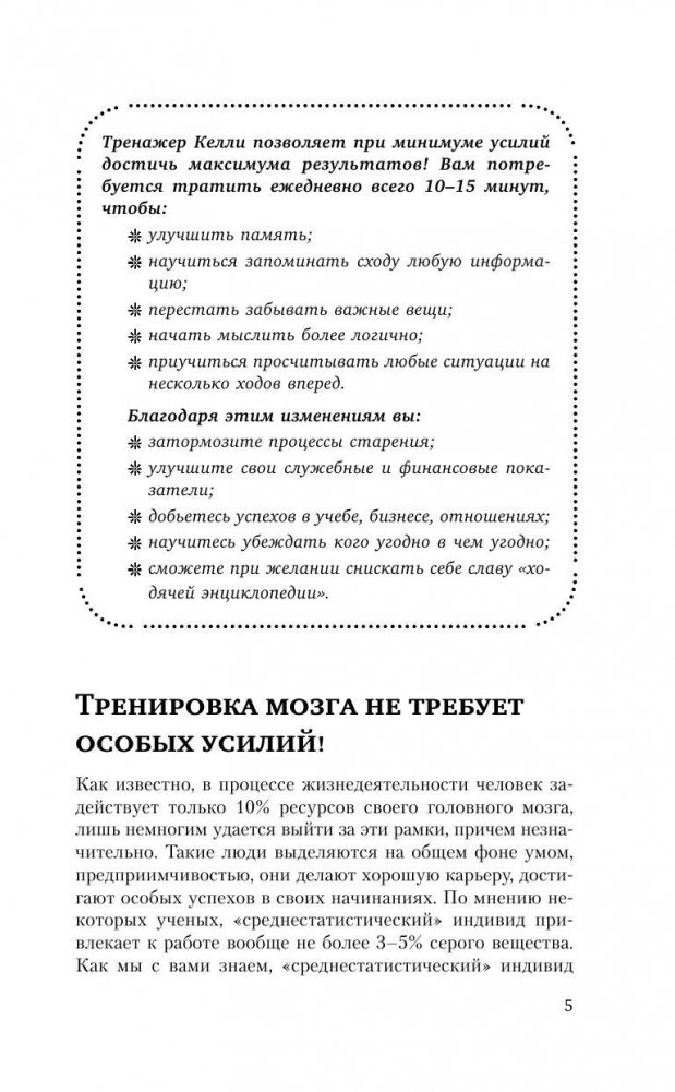 Книга представляет сенсационный тренажер головного мозга, созданный Патриком Келли. Осуществляя ежедневную "интеллектуальную гимнастику" (решая несложные задачки, запоминая слова), мы тренируем особые зоны мозга, ответственные за память и креативность (то есть за творчество, изобретательность, нестандартность). В результате таких тренировок увеличиваются показатели интеллекта, мышление становится острее и глубже, у занимающегося, открываются новые способности! Тысячи последователей Келли во всем мире обеспечили себе карьерный рост, успехи в бизнесе, общее благополучие, начав заниматься с тренажером. Теперь такая возможность появилась и у россиян! Все, что от вас понадобится, - несколько недель ежедневно тратить 5-10 минут на простенькие упражнения. Начните заниматься сегодня, и результаты последуют уже завтра!