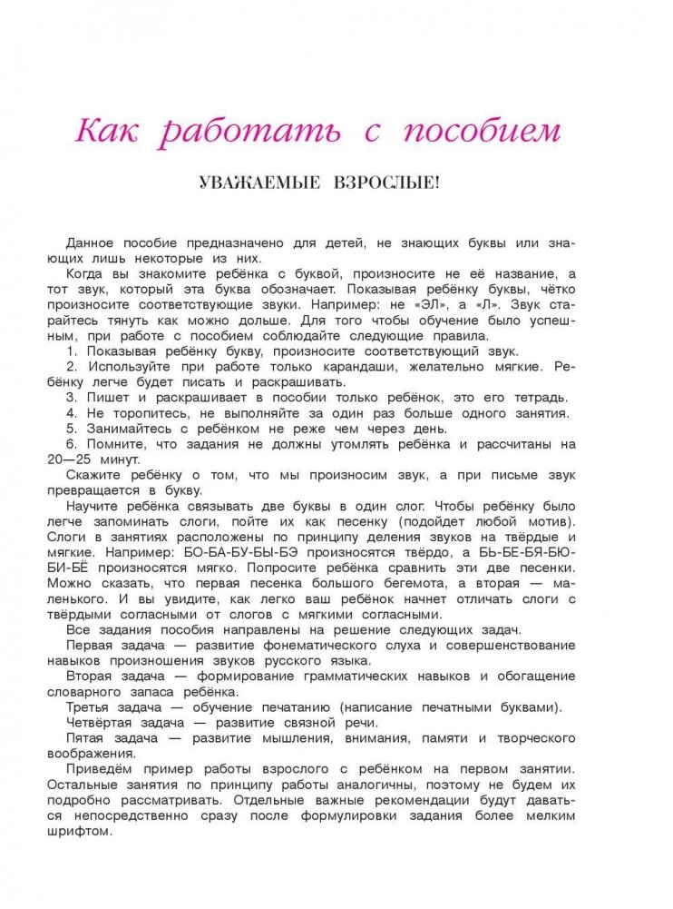 Основная задача данной книги — подготовить ребенка, не знакомого с буквами, к обучению чтению. Система разнообразных заданий направлена на развитие связной речи, мышления, внимания, памяти, творческого воображения. Регулярно занимаясь по пособию, малыш научится читать по слогам двух- трехсложные слова, определять звуки в словах, составлять рассказ по картинке, писать печатные буквы и несложные слова. Предназначено воспитателям дошкольных образовательных учреждений, гувернерам и родителям для занятий с детьми как в детском саду, так и в домашних условиях.