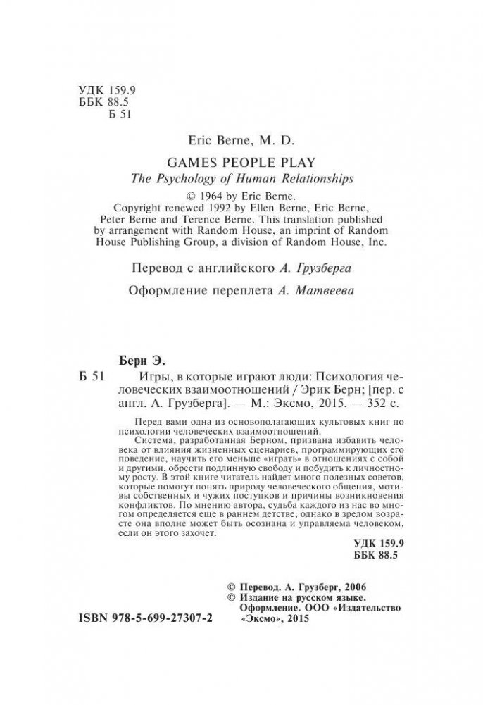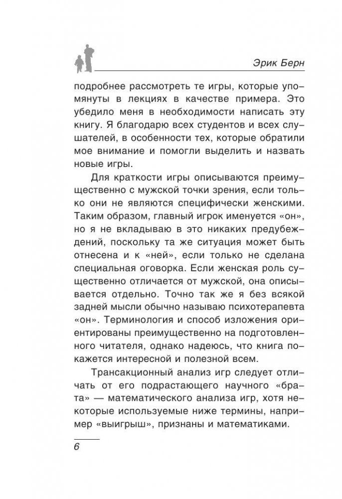 В этой книге представлена авторская система и структурный анализ моделей поведения людей и человеческих взаимоотношений. Опираясь на собственную многолетнюю психотерапевтическую практику, автор описывает различные сценарии игр, которые в большой степени определены в детстве и бессознательно разыгрываются людьми каждый день. Эта книга позволит понять мотивацию чужих поступков, увидеть причину конфликтов и способ их разрешить. Она поможет разобраться в себе, проанализировать собственный привычный сценарий, осмыслить и оттолкнуться от него, обрести личностную свободу и изменить свою жизнь по собственной воле.