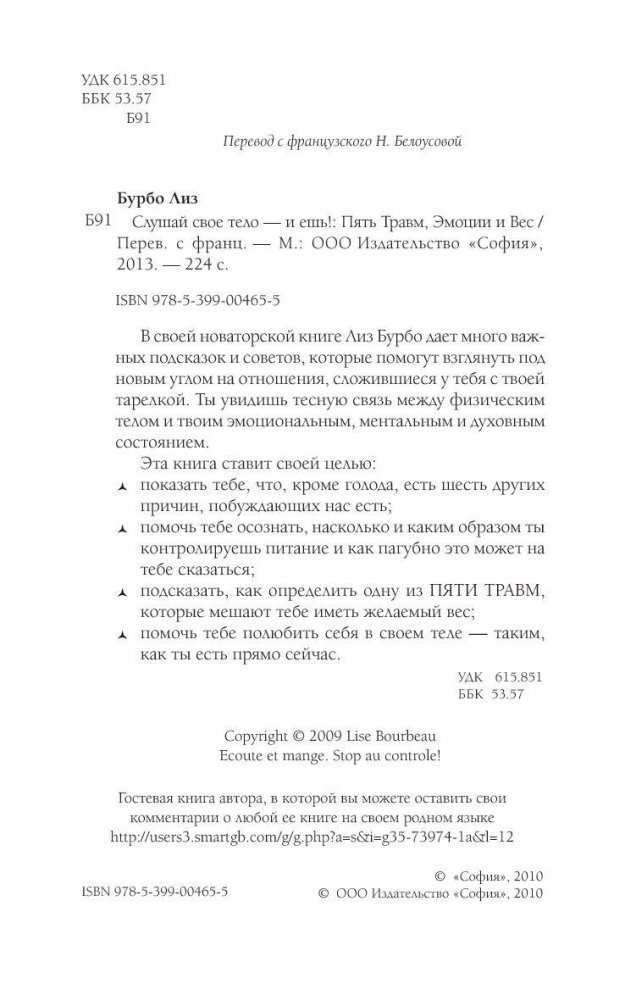 В своей новаторской книге Лиз Бурбо дает много важных подсказок и советов, которые помогут взглянуть под новым углом на отношения, сложившиеся у тебя с твоей тарелкой. Ты увидишь тесную связь между физическим телом и твоим эмоциональным, ментальным и духовным состоянием. Эта книга ставит своей целью: - показать тебе, что кроме голода есть шесть других причин, побуждающих нас есть; - помочь тебе осознать, насколько и каким образом ты контролируешь питание и как пагубно это может на тебе сказаться; - подсказать, как определить одну из ПЯТИ ТРАВМ, которые мешают тебе иметь желаемый вес; - помочь тебе полюбить себя в своем теле — таким, как ты есть прямо сейчас.