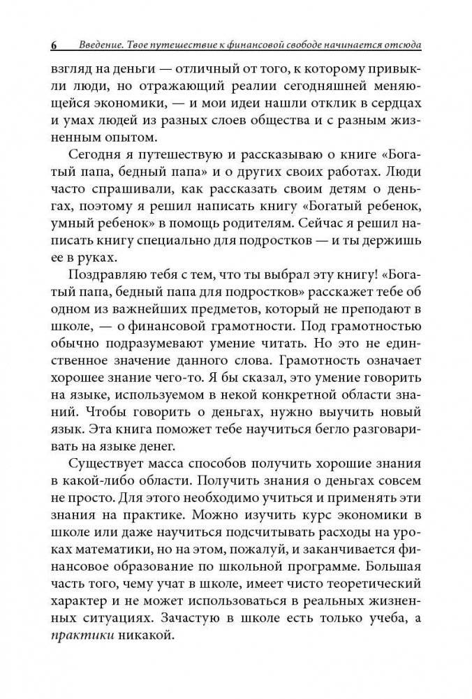Знания, которые ты получаешь в школе, тебе вряд ли когда-нибудь пригодятся? Учителя не готовят тебя к жизни в реальном мире? Значит, эта книга — для тебя! Она поможет тинейджерам уже сегодня сделать правильный выбор — именно тот выбор, благодаря которому люди становятся по-настоящему богатыми. Роберт Кийосаки дает возможность каждому подростку получить элементарные основы финансовой грамотности и добиться своей цели — научиться делать деньги.