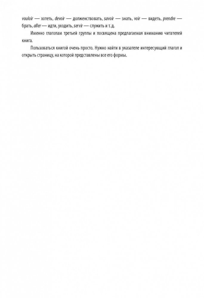 В предлагаемом вниманию изучающих французских язык учебном пособии приводится спряжение глаголов третьей группы. Известно, что эти глаголы спрягаются не по правилам и вызывают немало трудностей. Пользоваться книгой предельно просто: в указателе следует найти нужный глагол и открыть указанную страницу, на которой представлены все его формы. Пособие, без сомнения, будет полезно учащимся школ, студентам как филологических, так и нефилологических факультетов высших учебных заведений и слушателям курсов иностранных языков.